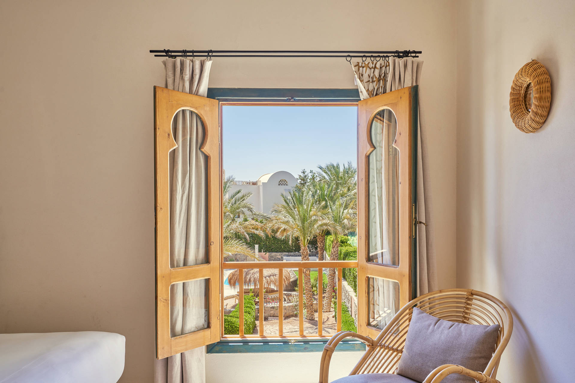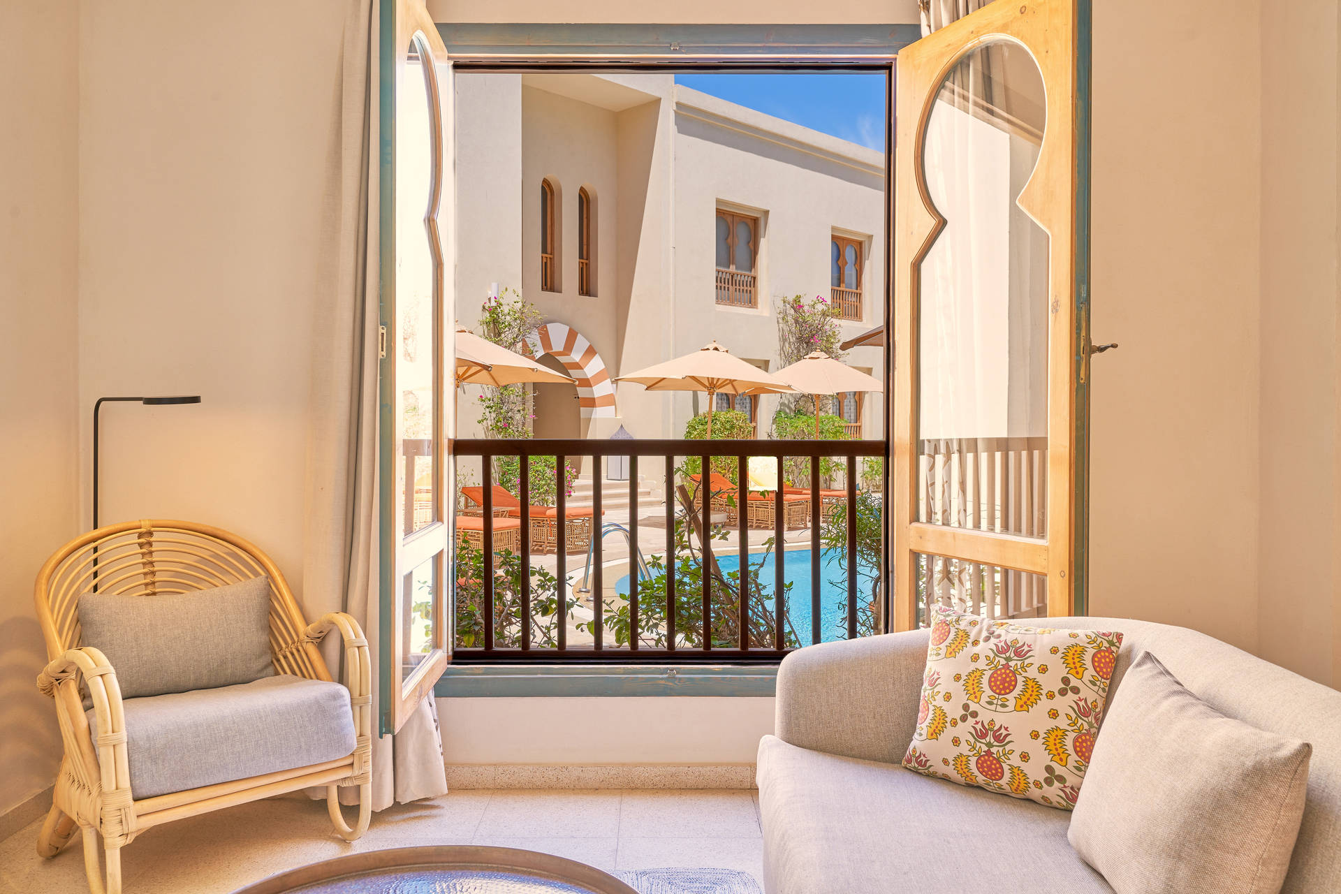 Si vous souhaitez un confort supplémentaire vous pouvez opter, avec supplément, pour la chambre Junior Suite avec vue sur la piscine ou la cour de l'hôtel d'une superficie de 41 m² avec un salon séparé de la chambre dans un style riche en bambou et de tissu arabesques.