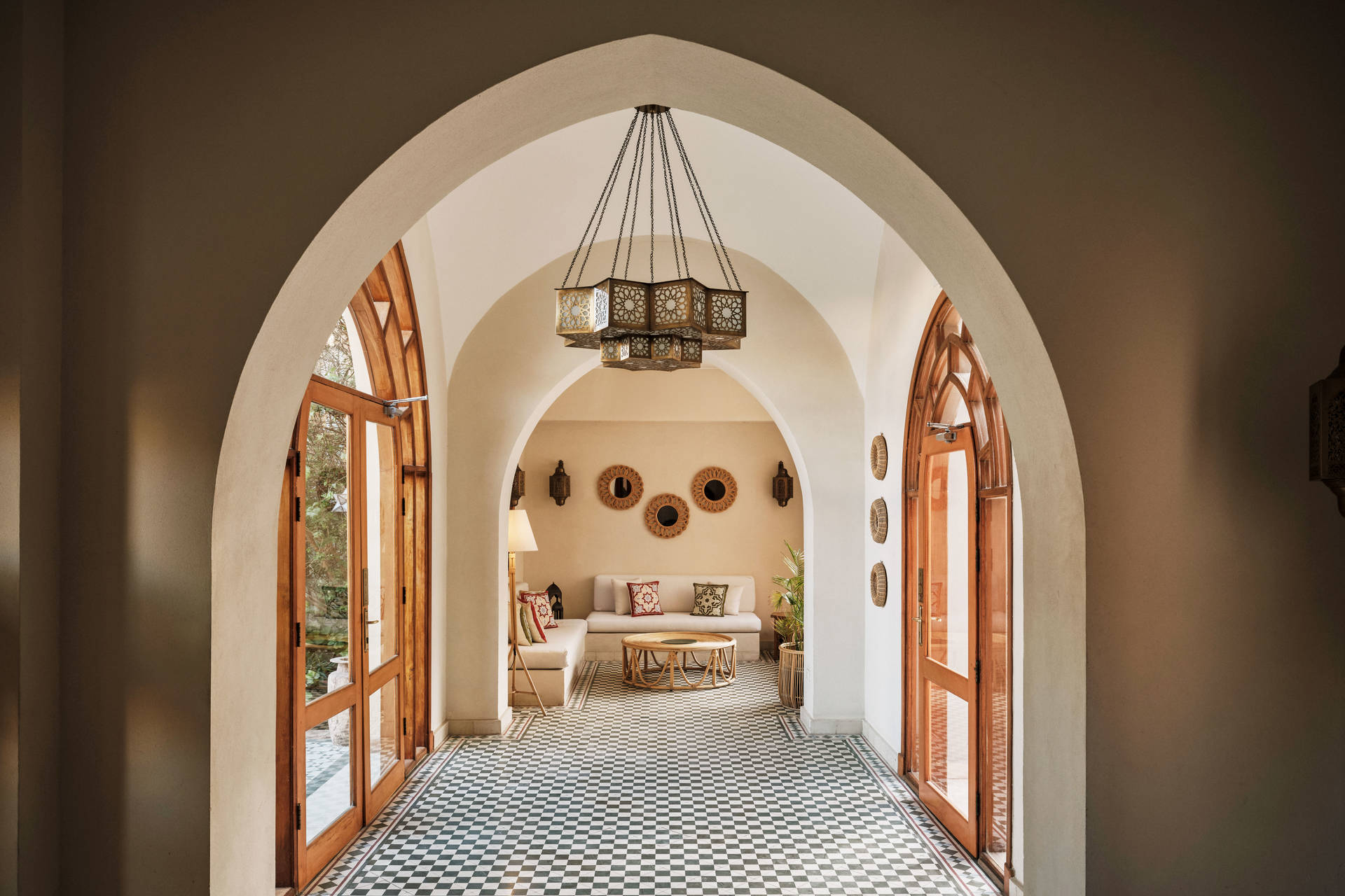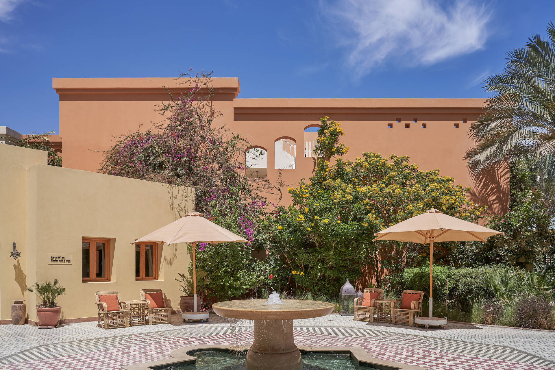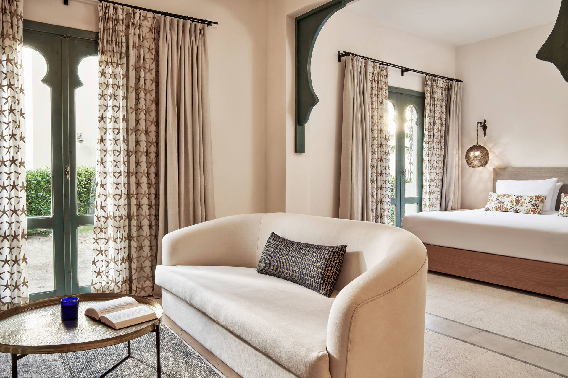 Vous pouvez également opter, avec supplément pour la Ali Pasha Suite. Des tons doux côte à côte avec des carreaux et tissus colorés, des vues apaisantes sur les jardins ou la piscine à l'ombre des palmiers de l'hôtel à travers des fenêtres en bois sculpté en arc, et un salon avec un canapé accueillant et une grande table basse en métal qui fait de cette suite de 49 m² un espace élégamment décoré pour se relaxer.