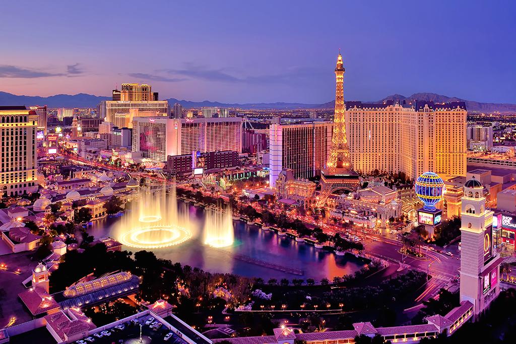 Déjeuner. Route vers Las Vegas, où on retrouve une ville surréaliste, comme sortie d’un conte de fées, où voisinent un New-York miniature, un Paris condensé, une pyramide égyptienne, et des gondoles vénitiennes. Chacun y trouve son compte : les joueurs flambent dans les casinos, les amoureux se marient en 2 heures, et les familles profitent des attractions. Dîner libre et nuit à l’hôtel.