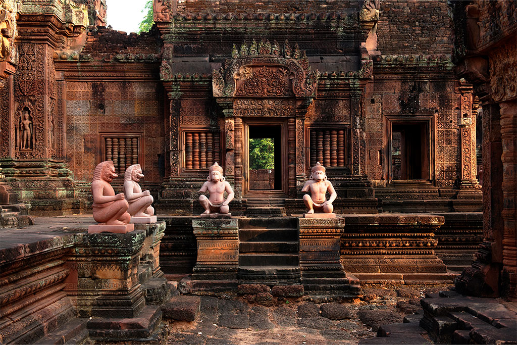 Petit-déjeuner. La matinée sera consacrée au Groupe de Roluos, l’ancêtre d’Angkor. Visite du Preah Ko que le roi Indravarman dédia à ses ancêtres, du Bakong et son monastère toujours en activité et le Lolei sur son îlot au milieu d’un lac servant de réservoir. Déjeuner dans un restaurant local. Cet après-midi, descente de la montagne et continuation vers Banteay Srei, « la citadelle des femmes ». Situé à 30 km au nord-est d’Angkor Wat, c’est l’une des plus parfaites et des plus attachantes créations architecturales érigées au Cambodge. Les bâtiments, qui ont conservé des décors d’une grande finesse sculptés dans le grès rose, ont fait la célébrité de ce temple. Poursuite vers Satcha, un centre original et ambitieux pour la création artisanale. Niché dans un parc luxuriant de 1 ha, dans un bâtiment à l’architecture unique, Satcha est devenu le rendez-vous incontournable pour découvrir l’artisanat khmer et rencontrer les artisans. Dîner spectacle de danse traditionnelle Apsara khmer dans un restaurant local. Retour à l’hôtel, nuit.