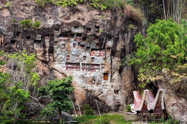 Journée consacrée à la découverte de la culture Toraja. Visite des principaux villages : la falaise de Lemo avec ses tombeaux creusés dans la roche et ses effigies mortuaires, Tampangallo et ses anciens caveaux avec petite balade dans une forêt de bambous, les sépultures creusées dans les arbres à Sarapung, et la falaise de Londa et sa grotte sacrée gardée par les effigies Tau Tau. Puis poursuite avec Kete Kesu, un des plus beaux villages Toraja avec ses superbes maisons Tongkonan et ses greniers à riz, puis retour à l’hôtel. (P.déj+Déj+Dîn)