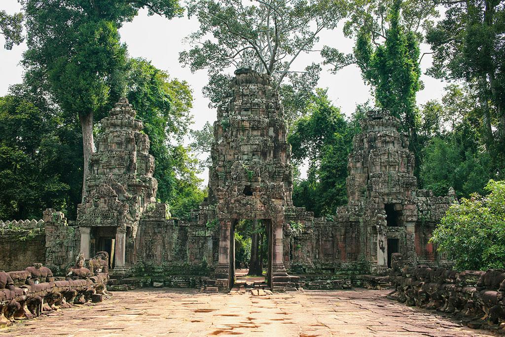 Petit-déjeuner. La journée débute par la visite de l’imposant site d’Angkor Thom, ancienne capitale royale khmère. Vous explorerez tout d’abord le Bayon, fascinant temple-montagne bouddhique du XII? siècle, célèbre pour ses tours ornées de visages sereins et énigmatiques. Poursuite avec le Baphuon, vaste sanctuaire du XI? siècle, restauré par l’École Française d’Extrême-Orient. Vous rejoindrez ensuite le Phimeanakas, ancien temple royal niché dans l’enceinte du Palais, avant de longer la Terrasse des Éléphants, lieu d’apparat depuis lequel le roi assistait aux cérémonies, et la Terrasse du Roi Lépreux, ainsi nommée en raison d’une statue représentant un juge des enfers à l’allure étrange et mystique. Déjeuner dans un restaurant local. L’après-midi, vous partirez à la découverte du mythique Ta Prohm, rendu célèbre pour son atmosphère saisissante. Envahi par les racines de fromagers géants, le temple a été volontairement laissé dans l’état où les archéologues l’ont découvert, offrant une immersion inoubliable dans un décor où la nature a repris ses droits. La visite se poursuit au sein du Grand Circuit avec Ta Keo, temple-pyramide massif à l’aspect sobre et mystérieusement inachevé, dépourvu de toute ornementation. La journée s’achève par la découverte du Neak Poan, un bassin rituel entouré de petits sanctuaires, autrefois dédié aux rites de purification. Dîner dans un restaurant local et nuit à l’hôtel Somadevi Angkor 5* (ou similaire).