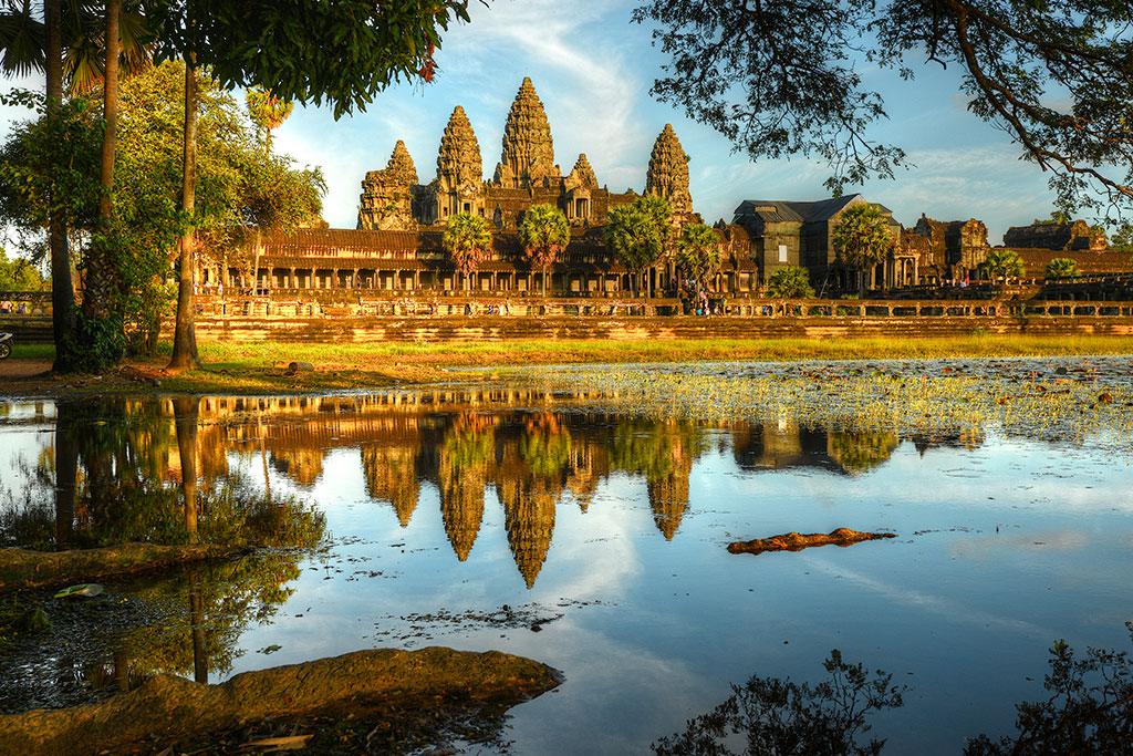 Petit-déjeuner. Départ dans la matinée pour rejoindre l’un des trésors les plus raffinés du site d’Angkor : Banteay Srei, la « Citadelle des Femmes », située à 35 km de la ville. Ce joyau de grès rose, réputé pour la finesse exceptionnelle de ses sculptures, est un véritable chef-d’œuvre de l’art khmer. Au retour, arrêt pour la visite du temple de Bakong, l’un des plus anciens temples-montagnes d’Angkor, appartenant au groupe de Roluos, berceau de la civilisation khmère. Déjeuner dans un restaurant local. L’après-midi est consacrée à l’exploration du mythique Angkor Wat, temple-montagne monumental érigé au XII? siècle par le roi Suryavarman II. Ce sanctuaire, sommet de l’architecture classique khmère, impressionne par son harmonie, la richesse de ses bas-reliefs et la puissance spirituelle qui s’en dégage. Si un seul monument devait représenter toute la splendeur d’Angkor, ce serait celui-ci. En fin de journée, ascension de la colline de Bakeng pour admirer le coucher de soleil sur les temples, avec une vue spectaculaire sur Angkor Wat baigné de lumière dorée. La soirée se conclut par un dîner-spectacle de danses Apsara khmères, dans l’atmosphère envoûtante d’un restaurant traditionnel. Nuit à l’hôtel Somadevi Angkor 5* (ou similaire).