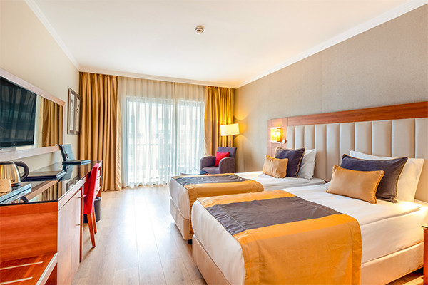 - Chambre standard vue mer (32 m²): mêmes équipements, balcon vue mer. Capacité maximum : 3 adultes (+ lit d'appoint).