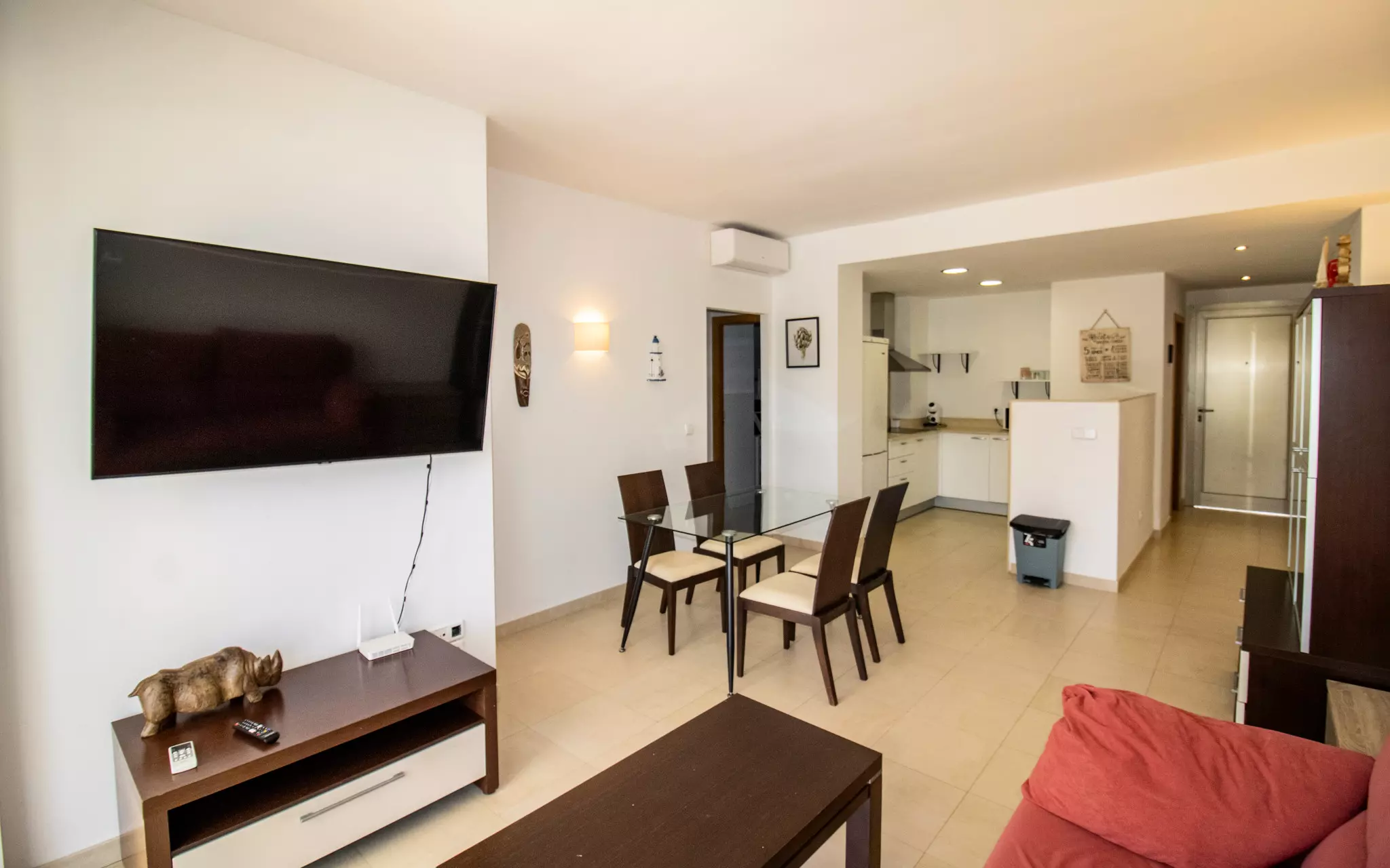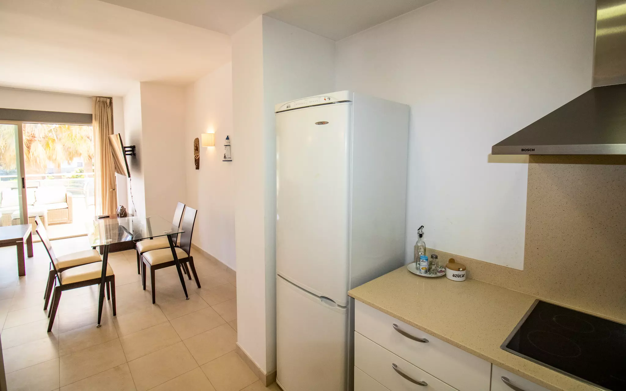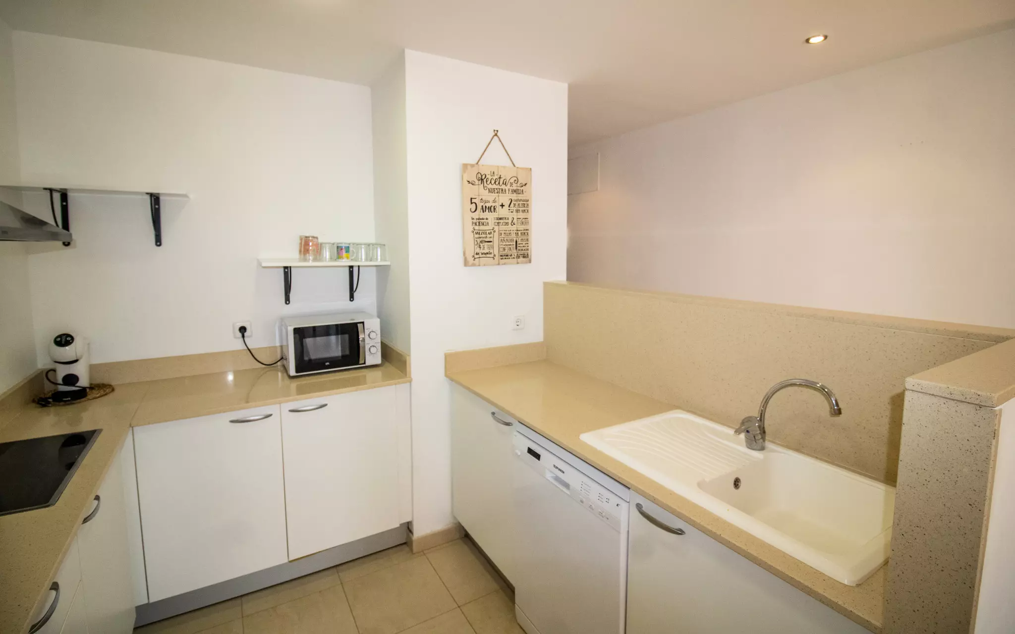 La cuisine indépendante, à vitrocéramique, est équipée avec réfrigérateur, micro-ondes, congélateur, lave-vaisselle, ustensiles/cuisine, cafetière et grille pain.