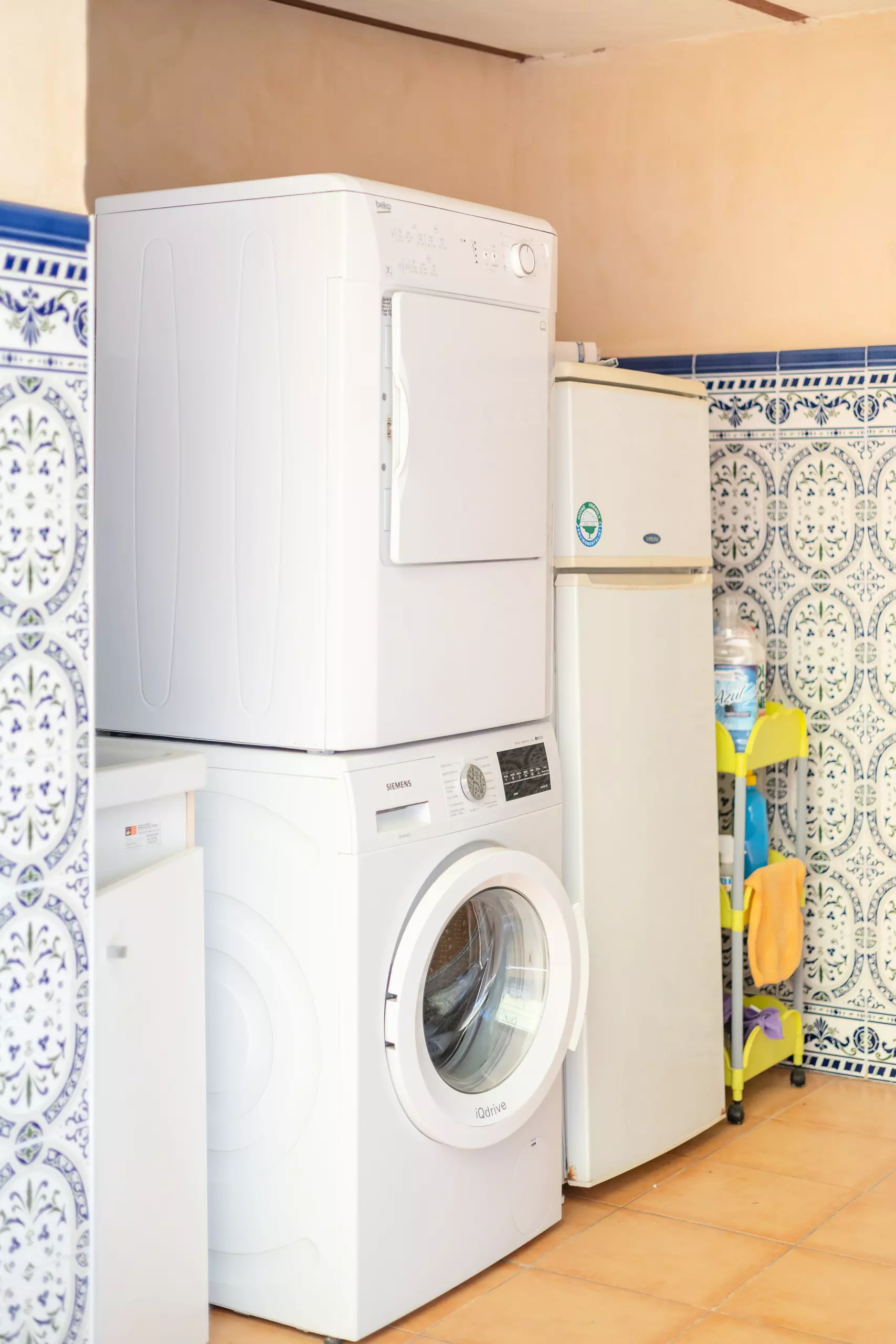 La cuisine indépendante, avec plaque vitrocéramique, est équipée d'un réfrigérateur, micro-ondes, four, congélateur, lave-linge, sèche-linge, lave-vaisselle, vaisselle/couverts, ustensiles de cuisine, cafetière, grille-pain, bouilloire, assiettes et bols, ustensiles de cuisine.