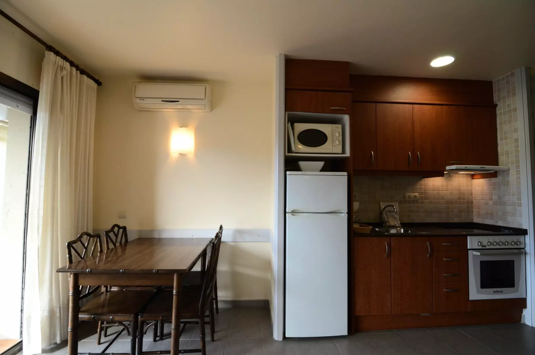 Dans la cuisine ouverte avec plaque vitrocéramique vous trouverez un réfrigérateur, un micro-ondes, un four, un congélateur, un lave-linge, de la vaisselle, des couverts, des ustensiles de cuisine, une cafetière, un grille-pain et un presse-agrumes.