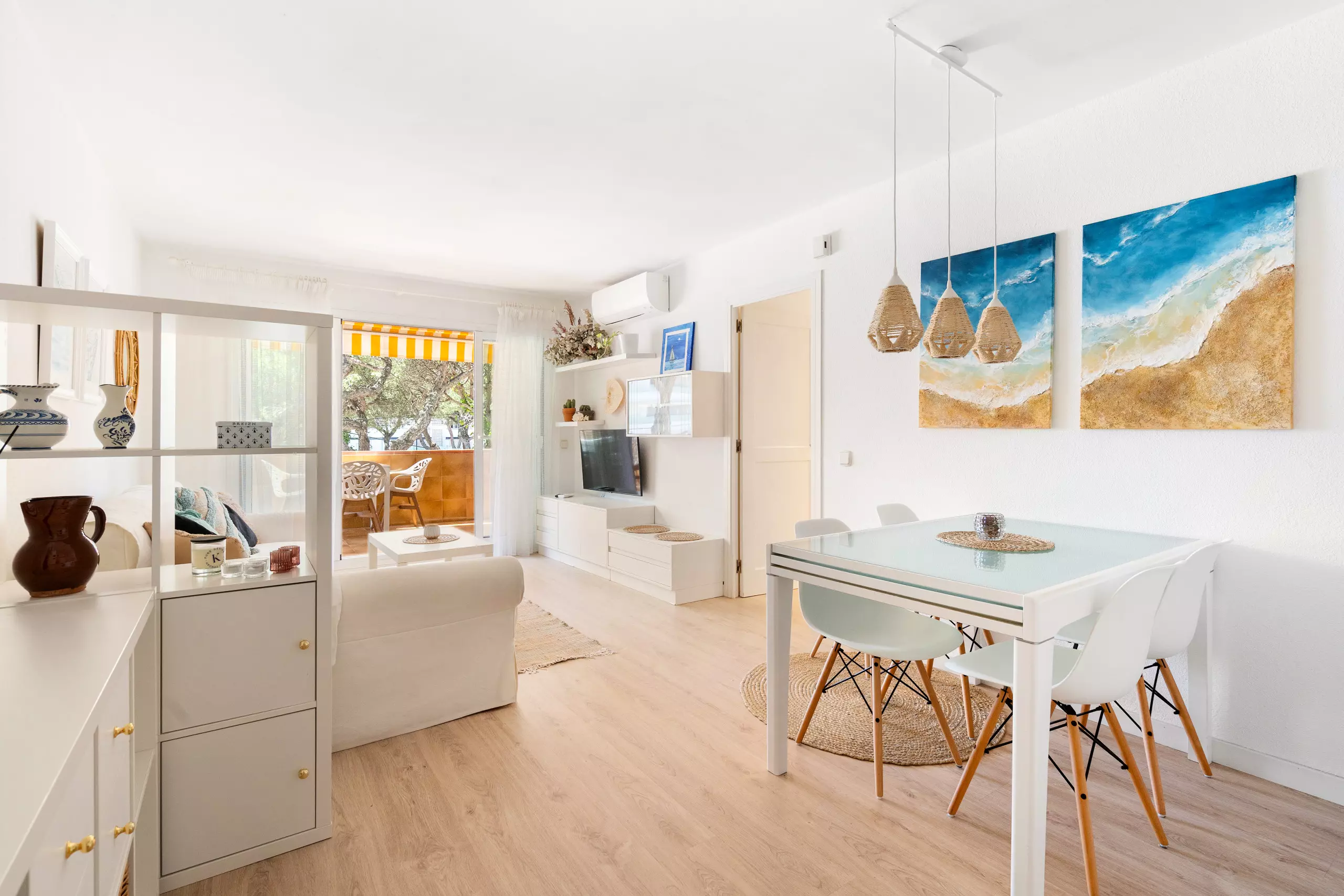 Le salon est spacieux et lumineux, avec une zone de salle à manger et un canapé-lit confortable, ainsi qu'une Smart TV et un accès direct à une terrasse privée, idéal pour se détendre tout en profitant d'une tasse de café ou d'un verre de vin. L'appartement dispose de 2 chambres doubles et est équipé de la climatisation.