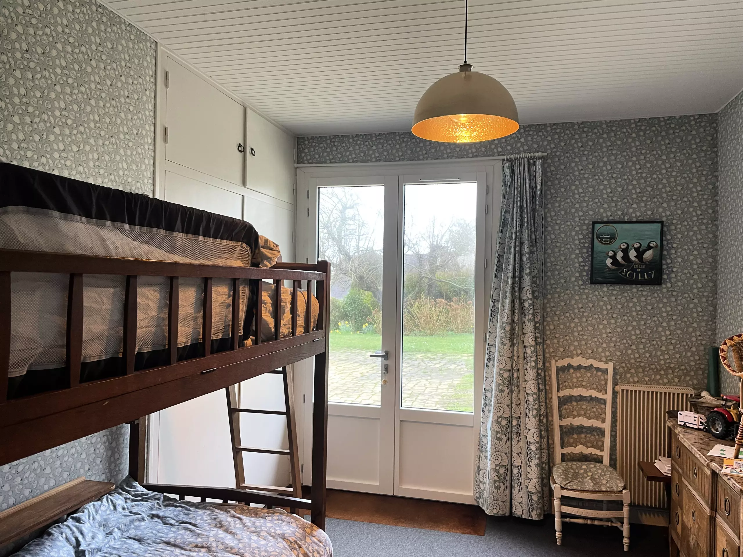 A l'étage, se trouve une chambre avec lit Queen Size (160x200cm) ainsi qu'un grand espace aménagé avec trois lits simples (90x190cm), un matelas d'appoint, des livres, des jeux ainsi qu'un bureau.