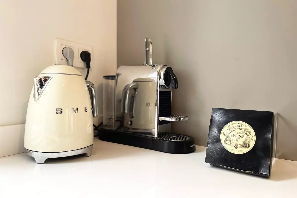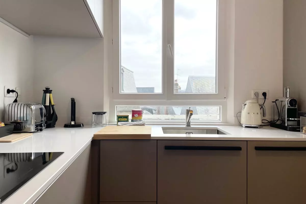 - Une cuisine américaine semi-ouverte, entièrement équipée : réfrigérateur, four, plaques à induction, lave-vaisselle, machine à café Nespresso, plan de travail, nombreux rangements et ustensiles de cuisine.
