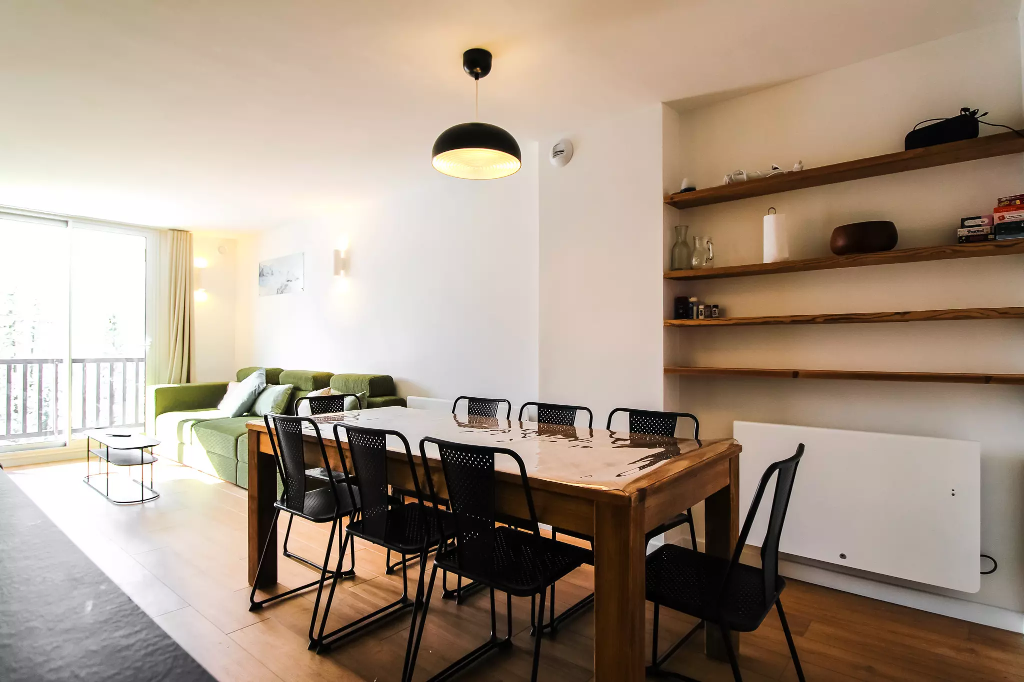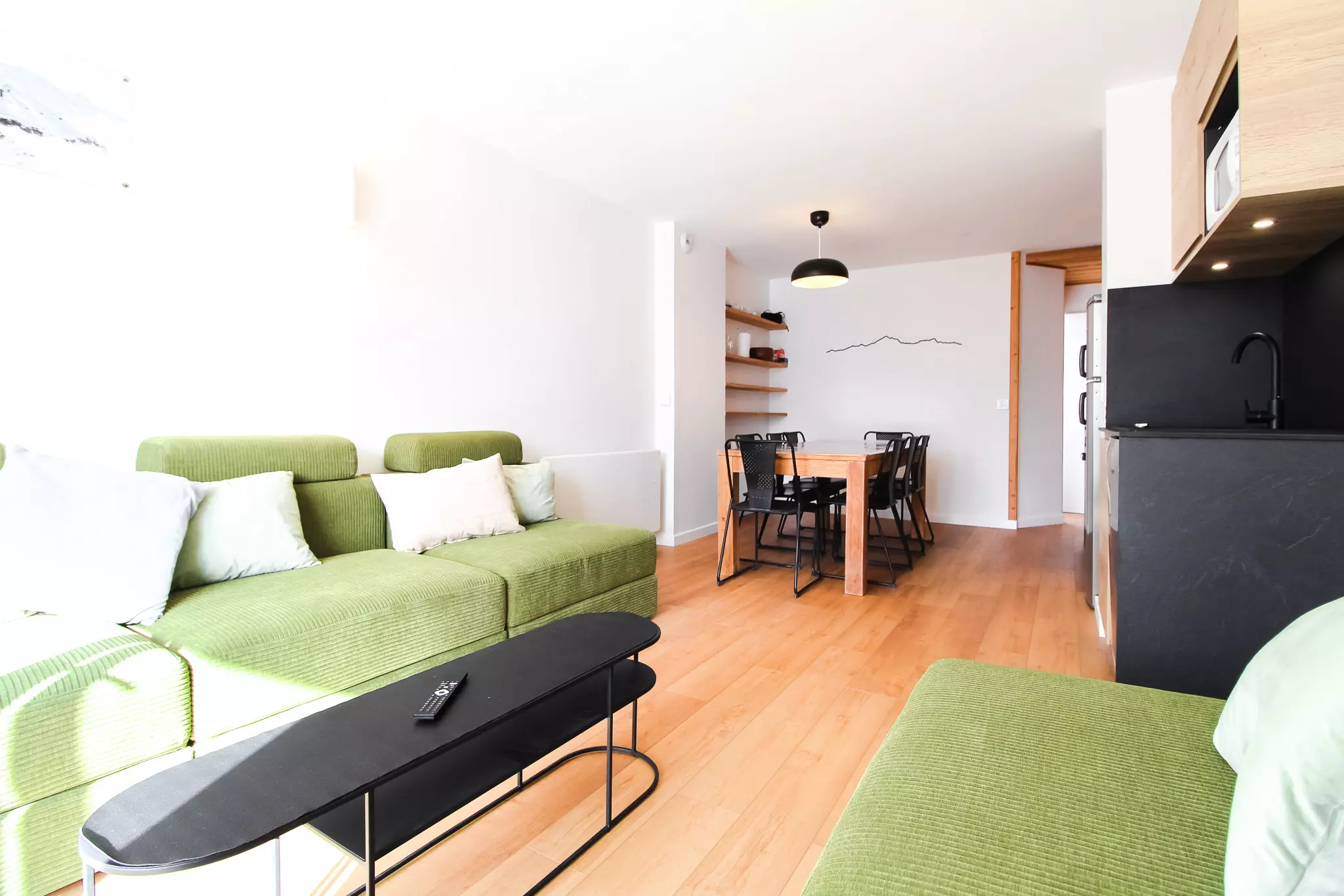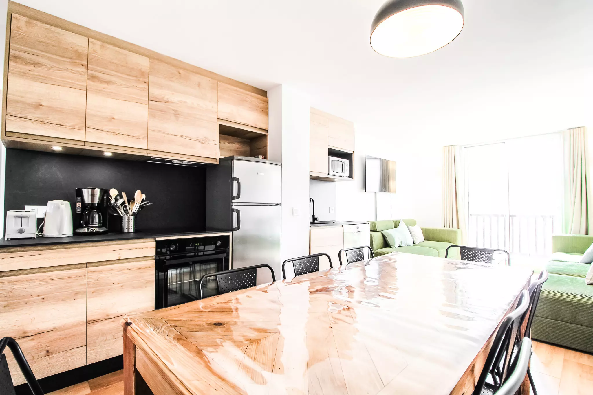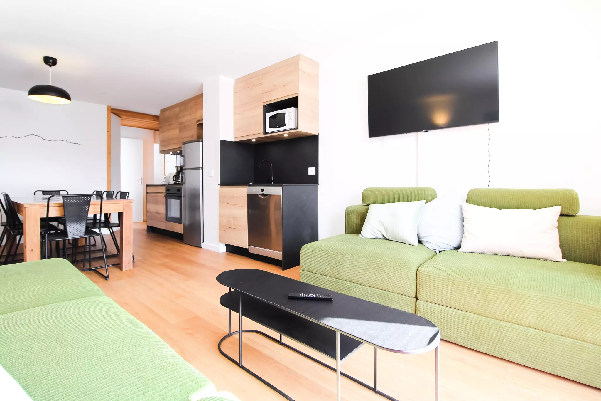 La cuisine spacieuse est entièrement équipée et dispose d'une grande table à manger avec beaucoup d'espace pour se réunir. Le salon dispose de canapés confortables, d'une télévision et d'un balcon attenant offrant de belles vues sur le domaine skiable de Flaine.