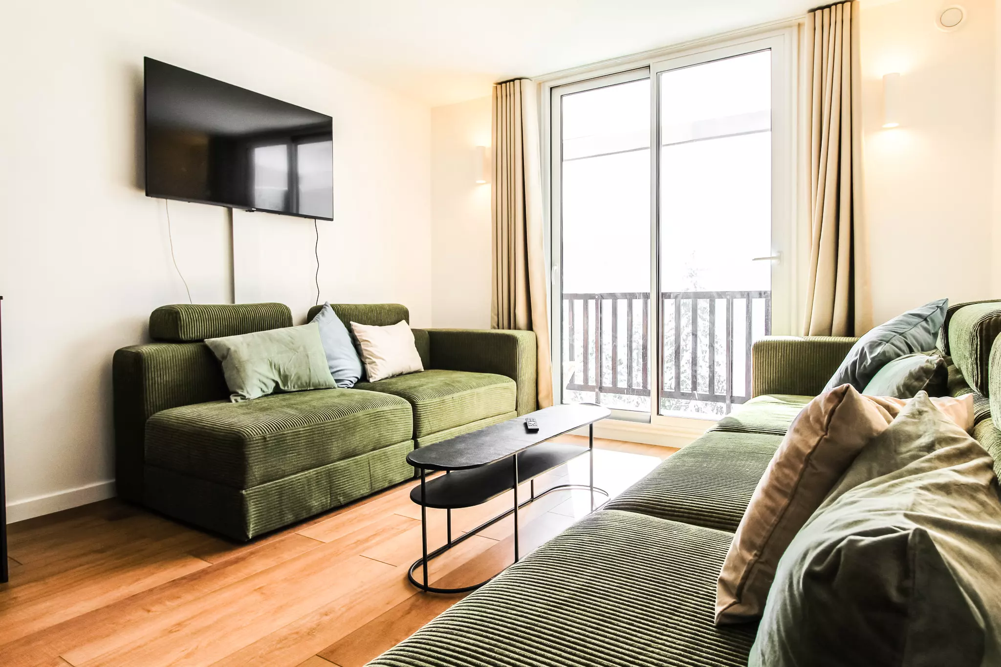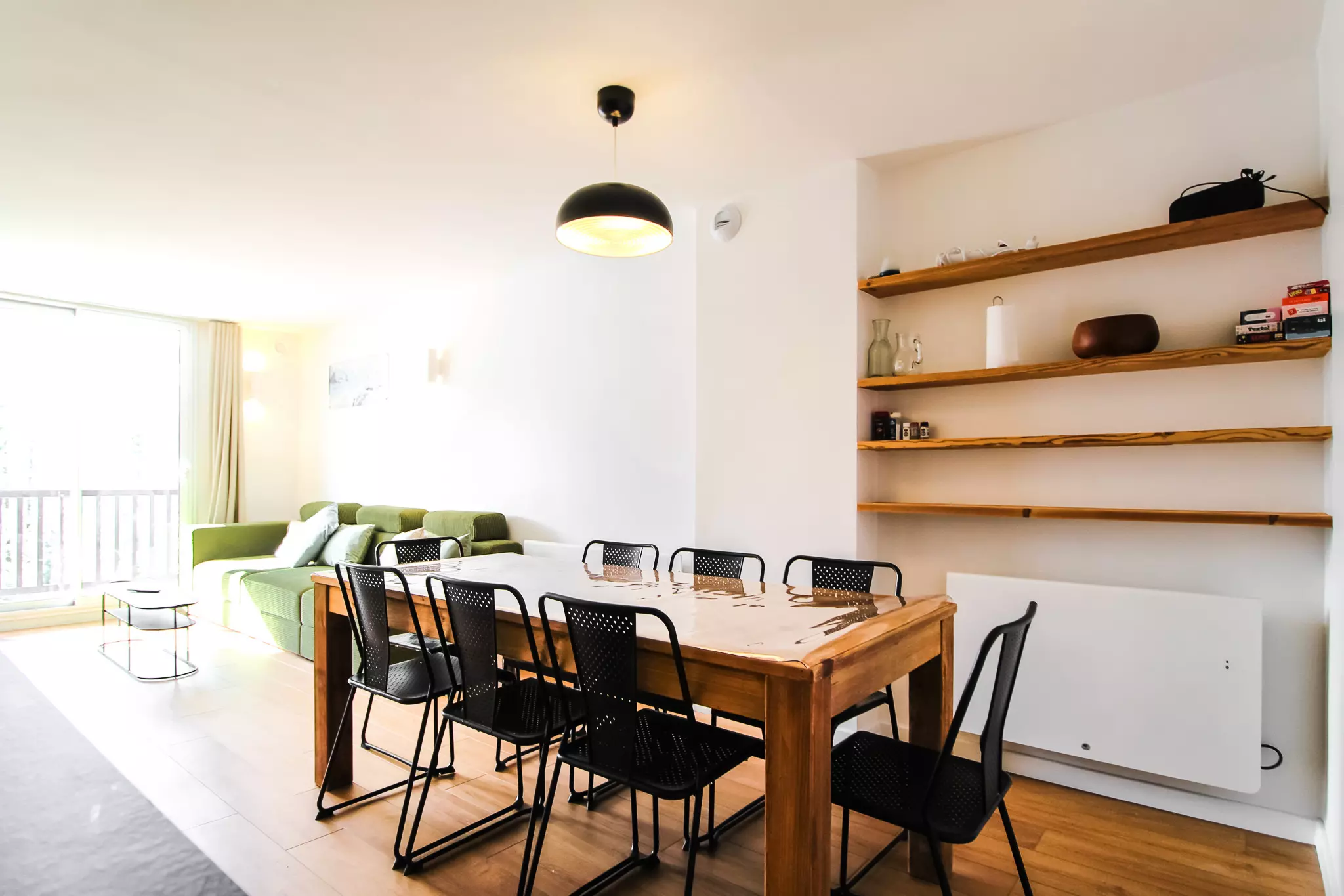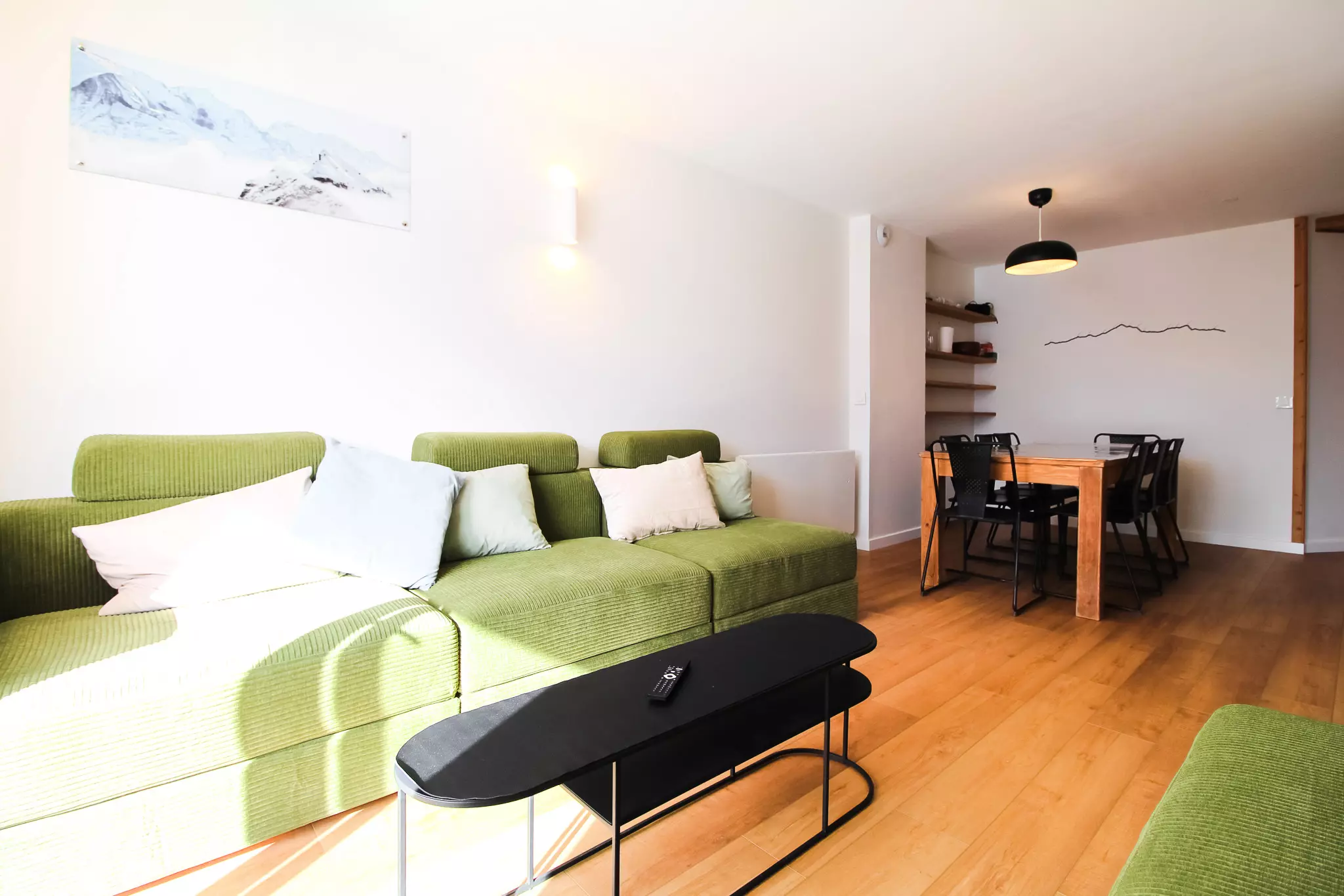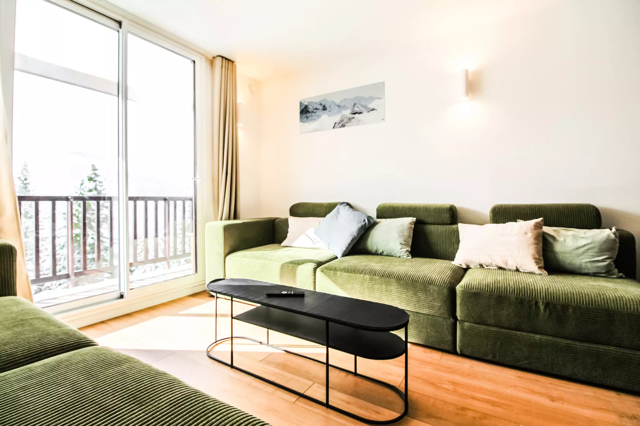 La cuisine spacieuse est entièrement équipée et dispose d'une grande table à manger avec beaucoup d'espace pour se réunir. Le salon dispose de canapés confortables, d'une télévision et d'un balcon attenant offrant de belles vues sur le domaine skiable de Flaine.