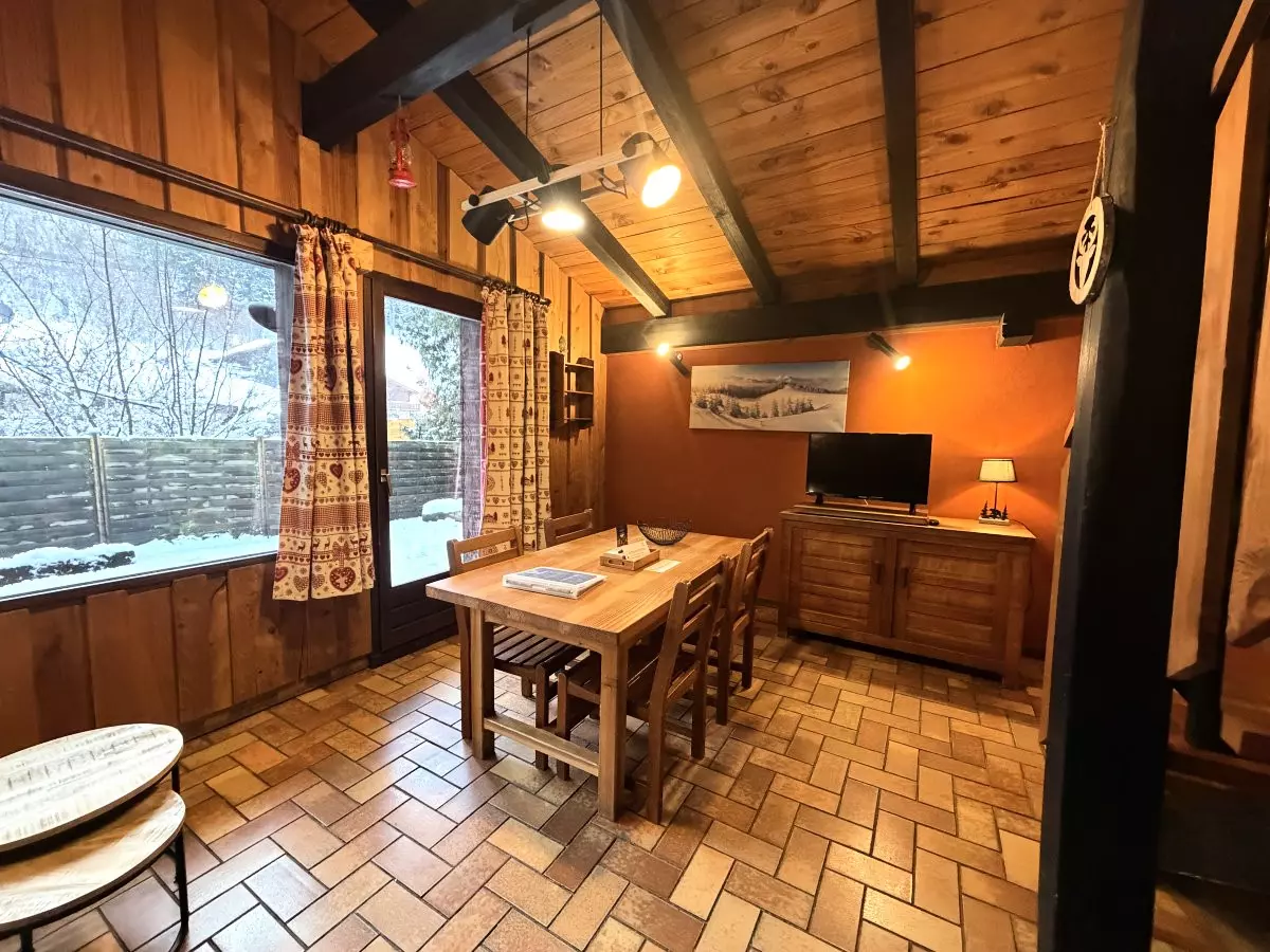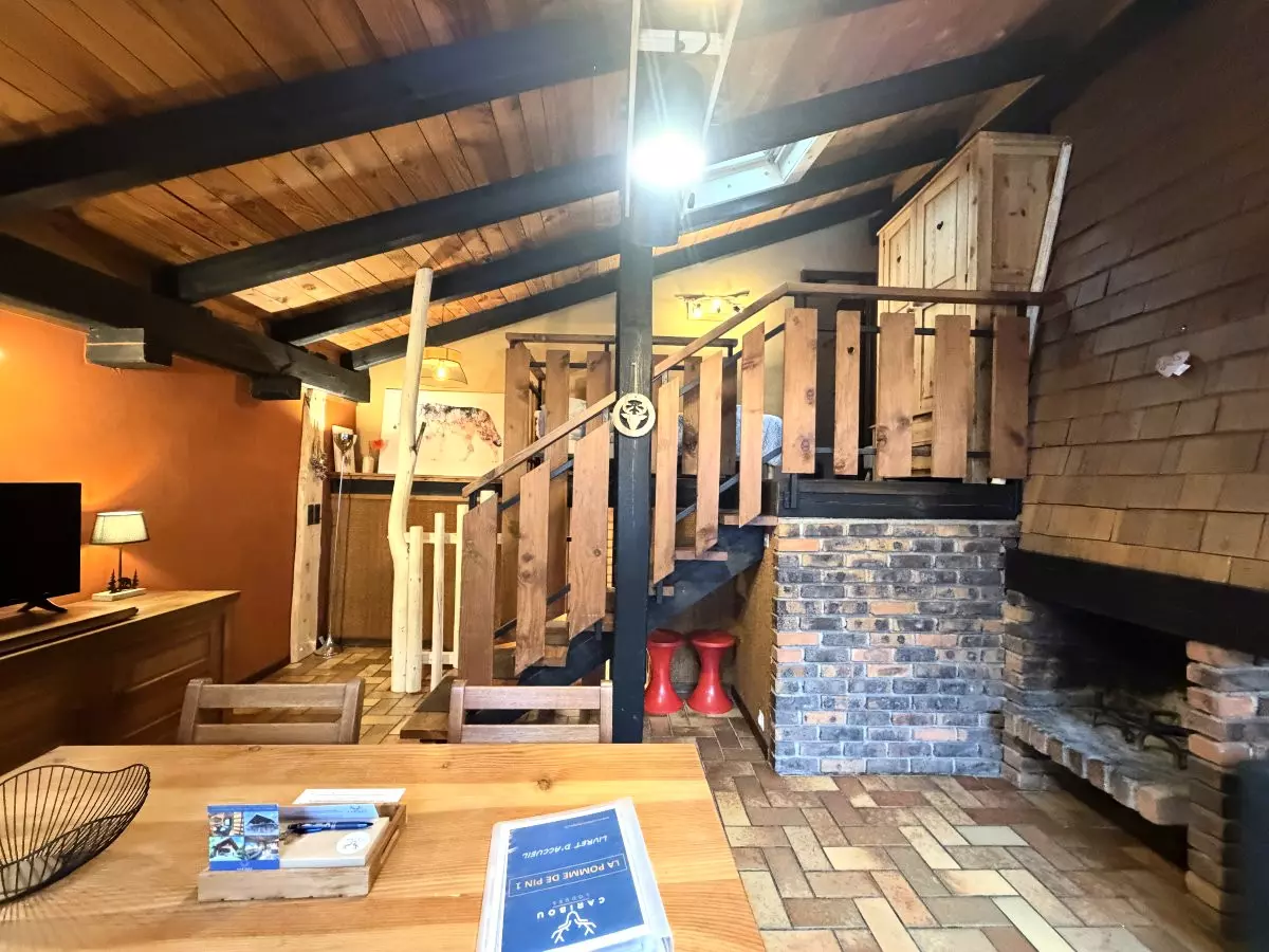 - Salon/Séjour : Espace chaleureux avec canapé confortable, cheminée, télévision à écran plat et coin repas, idéal pour se détendre en famille ou entre amis