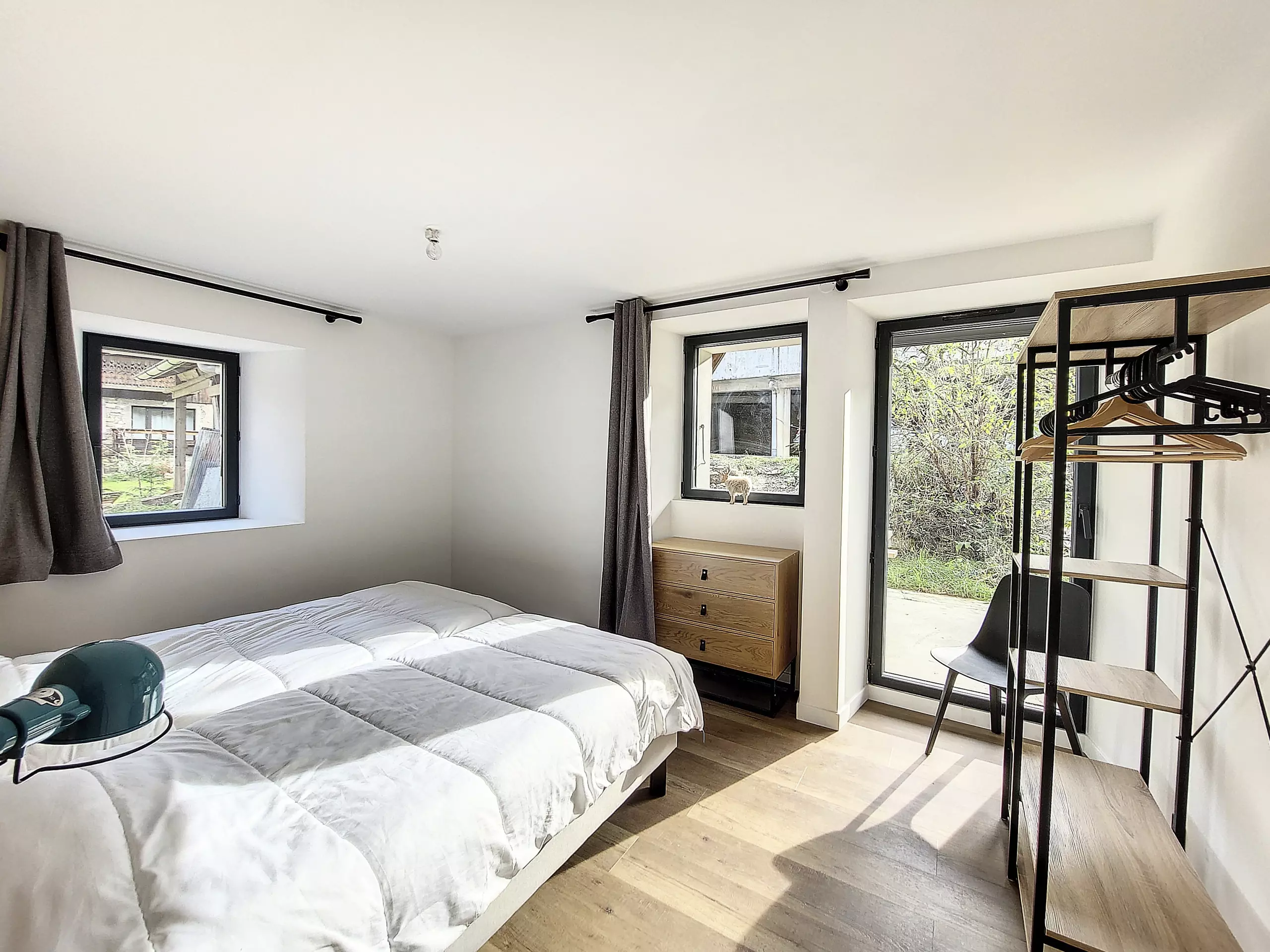 Une salle à manger avec table, chaises et baie vitrée donnant sur la terrasse exposée EST.