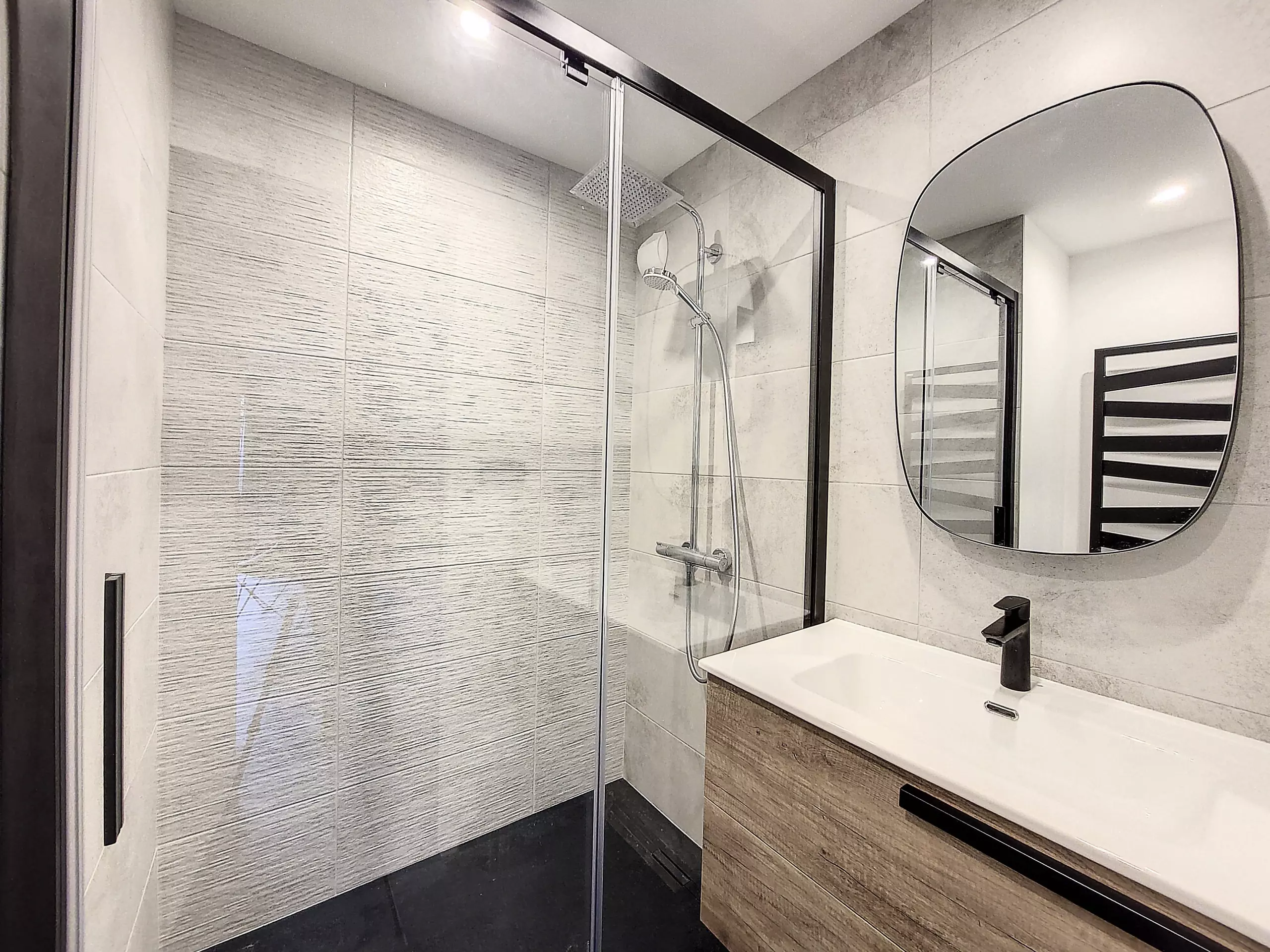 - Une salle de douche, avec vasque simple avec sèche serviette