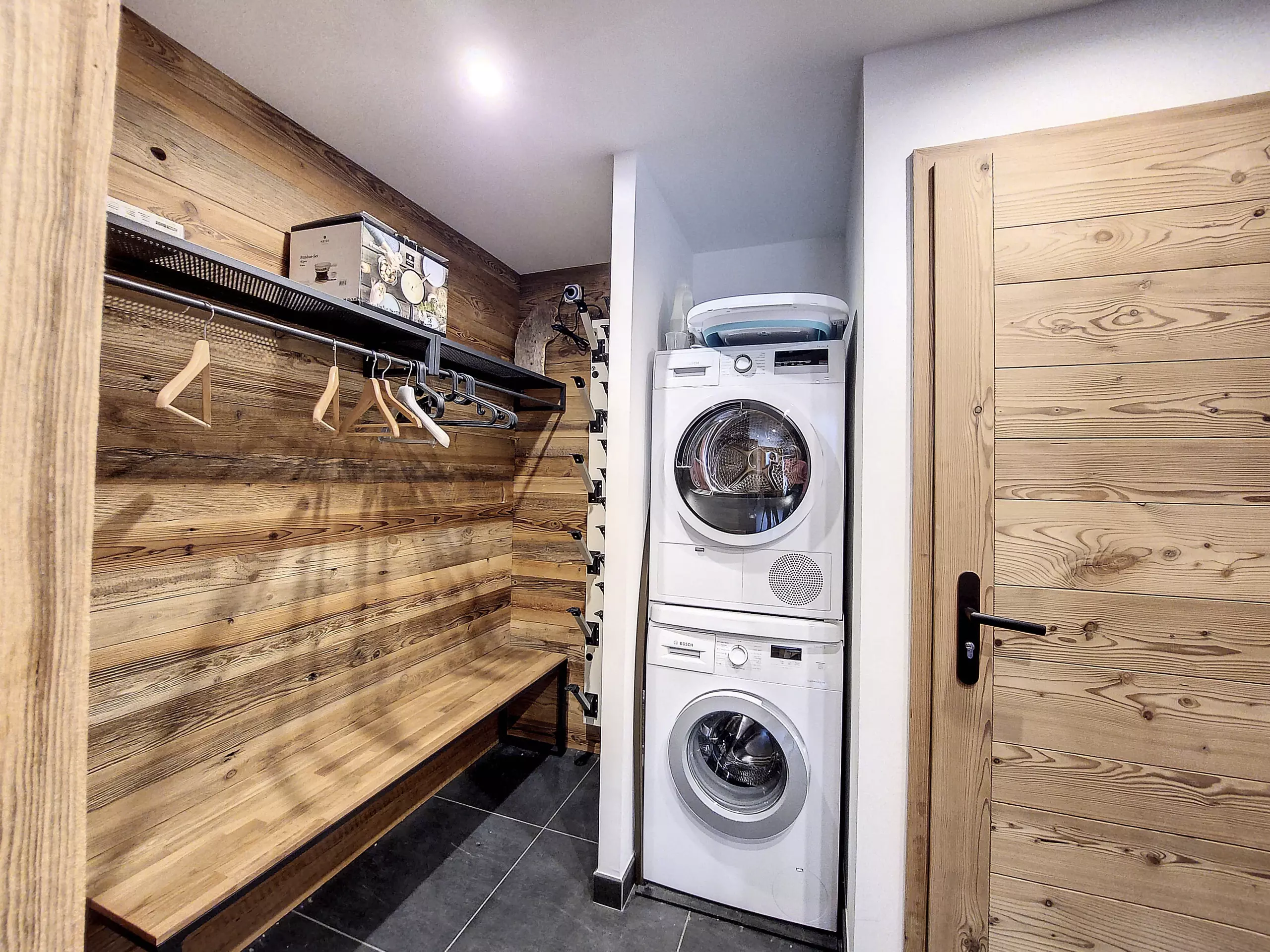 Un ski-room COMMUN entre les deux appartements du chalet avec buanderie (lave-linge et sèche-linge), sèche chaussures et gants, local à ski.