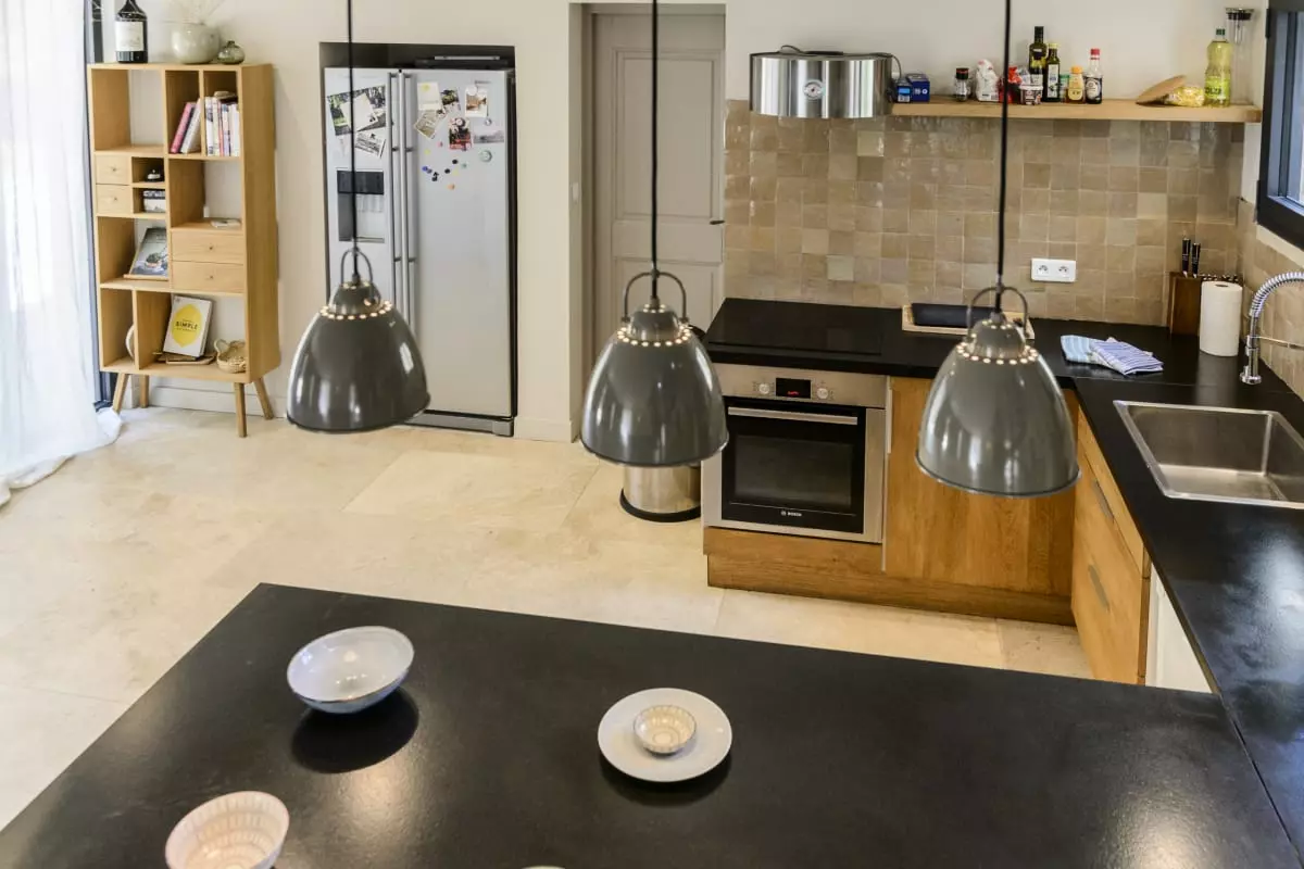La cuisine ouverte sur le séjour permet de préparer et déguster des repas ensemble. Le salon offre un canapé confortable pour se relaxer aux heures les plus chaudes. Wifi gratuit dans toute la maison pour rester connecté (pas télévision).