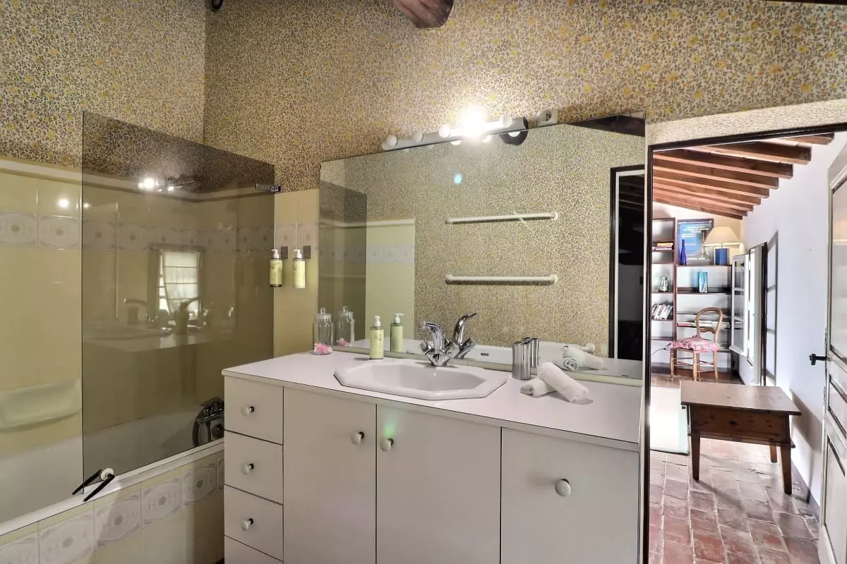 À l’intérieur, l’authenticité se marie à l’élégance : pierres anciennes, un majestueux escalier du XVIIᵉ siècle, lustres en ferronnerie, et carreaux en terre cuite créent une ambiance à la fois rustique et raffinée. Le salon à la française, avec sa cheminée en pierre imposante, est le cœur chaleureux de la bastide. La cuisine entièrement équipée et la salle à manger authentique promettent des repas joyeux et mémorables.