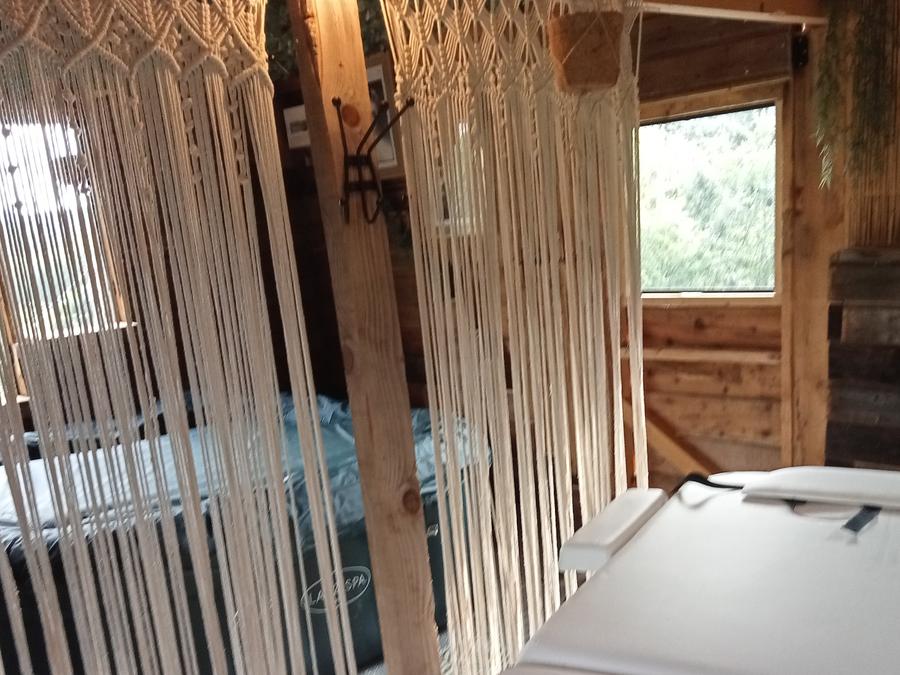 Sur un plancher bois, et avec des meubles tout en bois, vous disposez d'une tente toilée sous laquelle sont réparties :