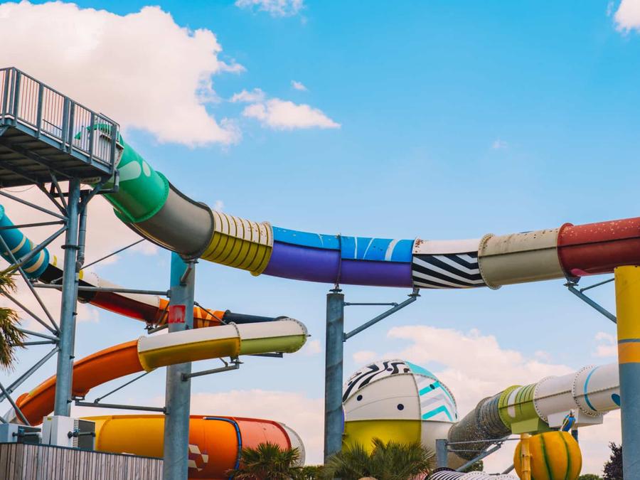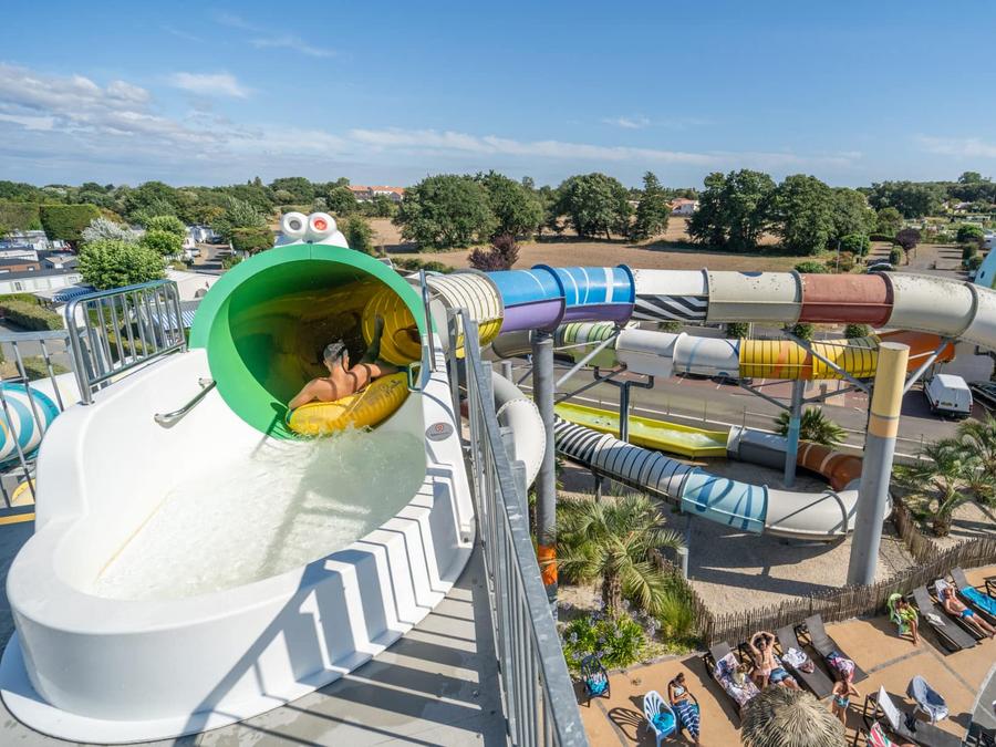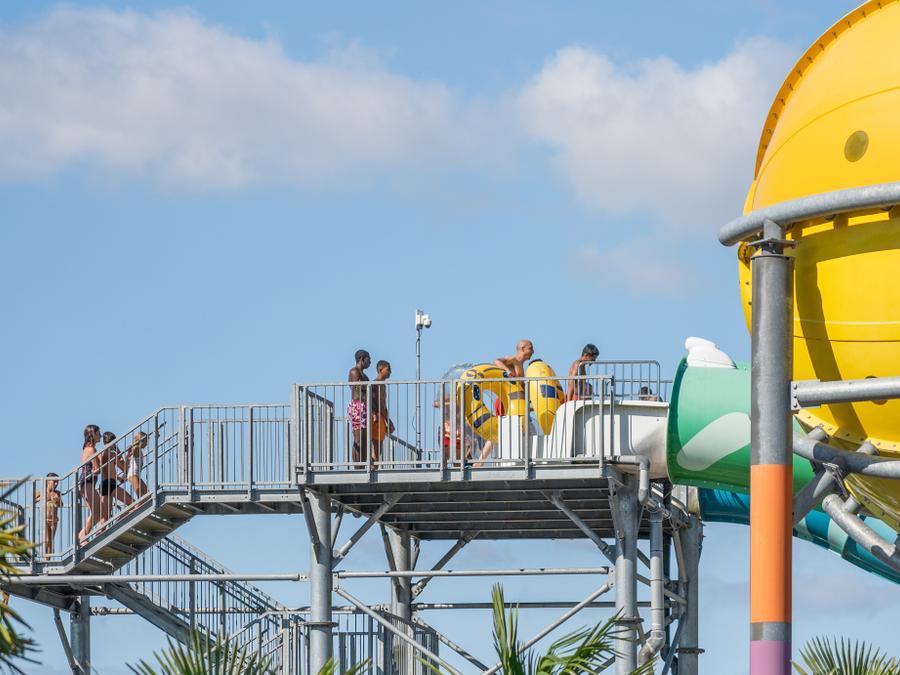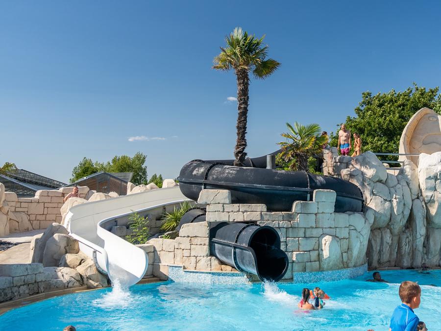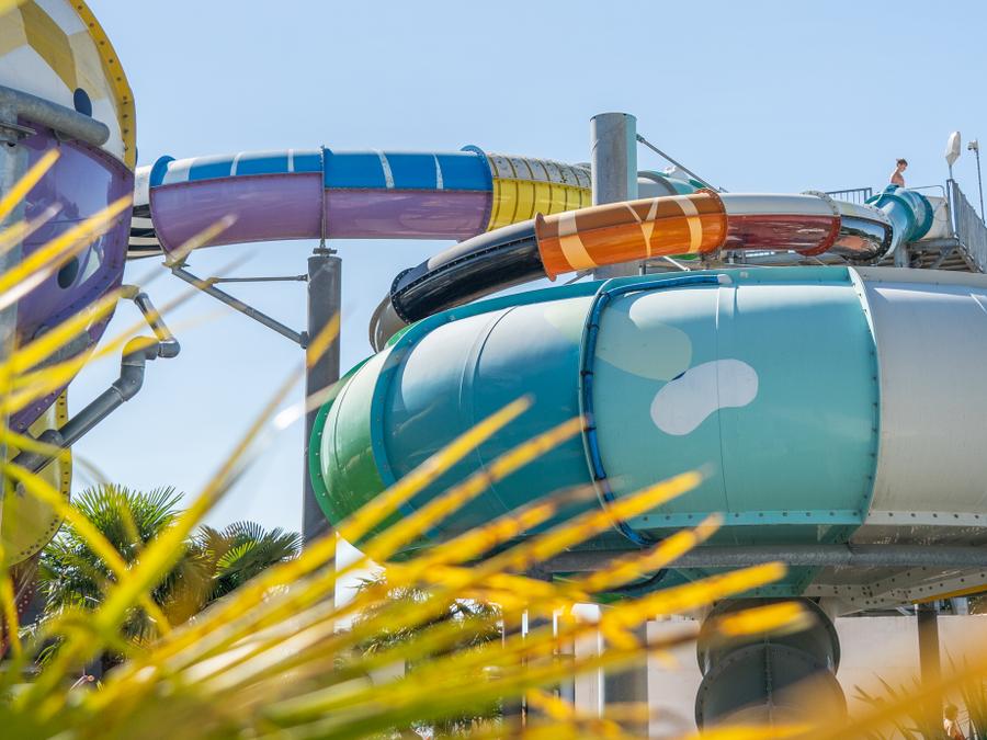 - Description : Piscine couverte et chauffée avec jacuzzi Piscine extérieure chauffée Bassin rectangulaire pour les longueurs 5 toboggans dont 2 à 12m de haut (Space Hole et Speed Ball) et 1 unique à 17m de haut (Racer - nouveauté 2026) Pataugeoire pour les enfants Espace solarium extérieur pour la détente Création d'un nouvel espace détente en 2026 avec 80 transats supplémentaires