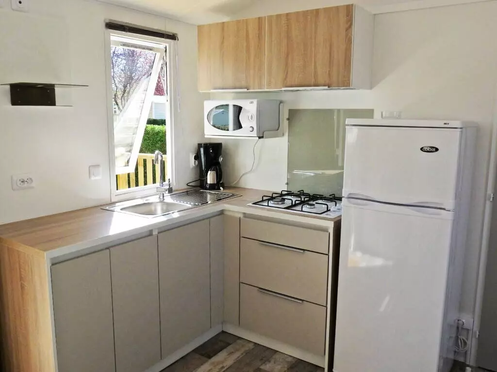 - Séjour / coin cuisine : Bouilloire, Cafetière électrique (filtre), Cuisine équipée, Evier, Micro-ondes, Plaque de cuisson 4 feux gaz, Réfrigérateur avec freezer, Table et chaises, Télévision