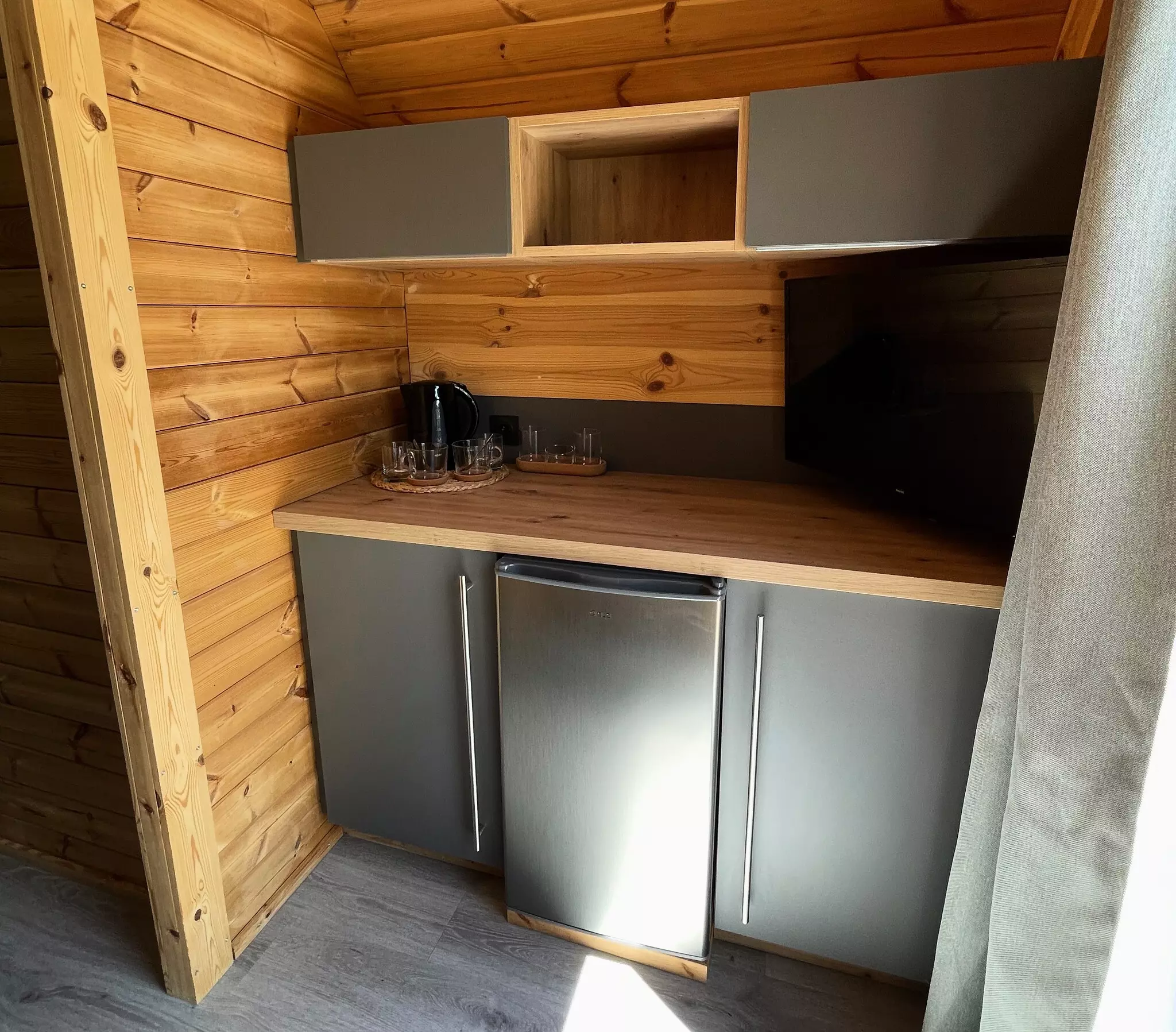 - Séjour / coin cuisine : Banquette, Bouilloire, Cafetière électrique (filtre), Cuisine équipée, Evier, Micro-ondes, Plaques de cuisson 4 feux électriques ou gaz, Réfrigérateur avec freezer, Table et chaises, Télévision