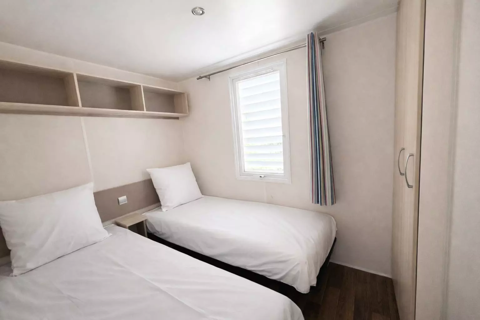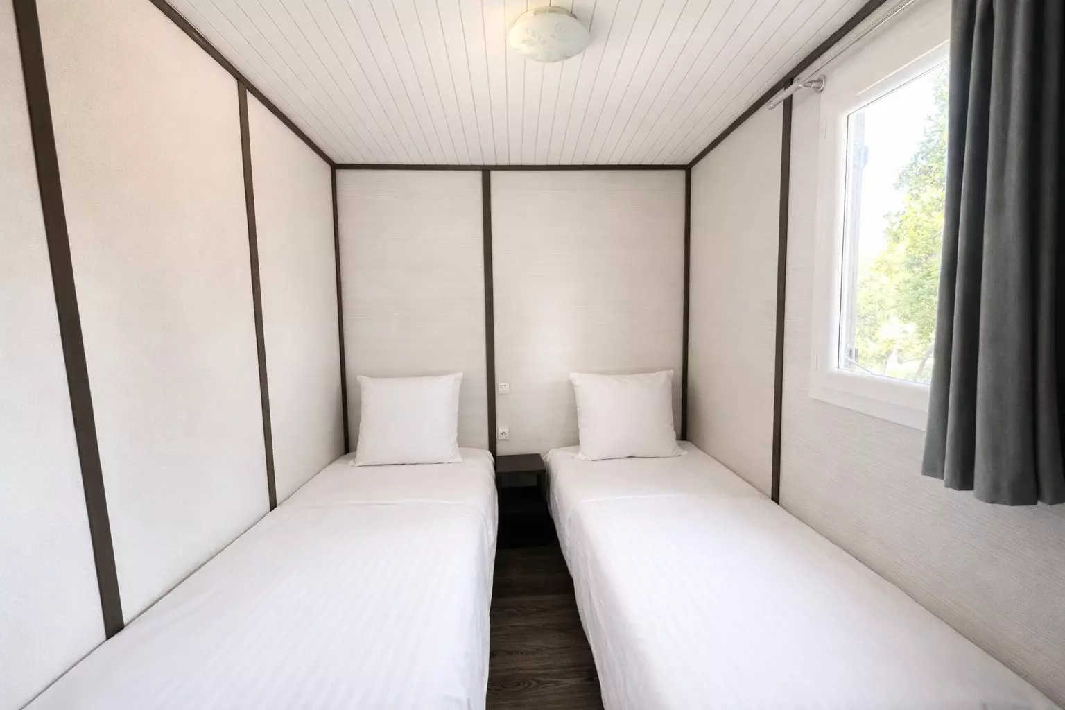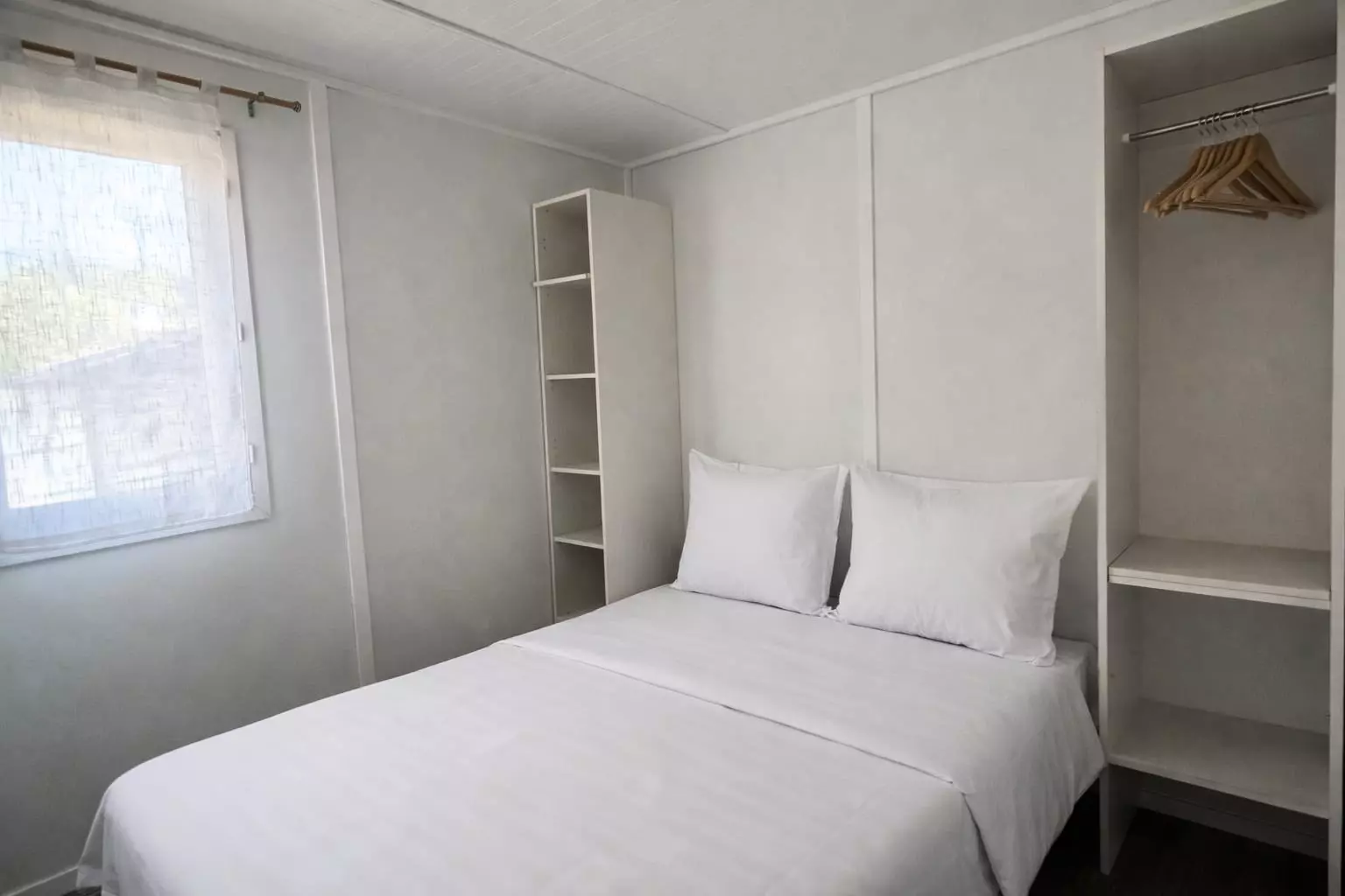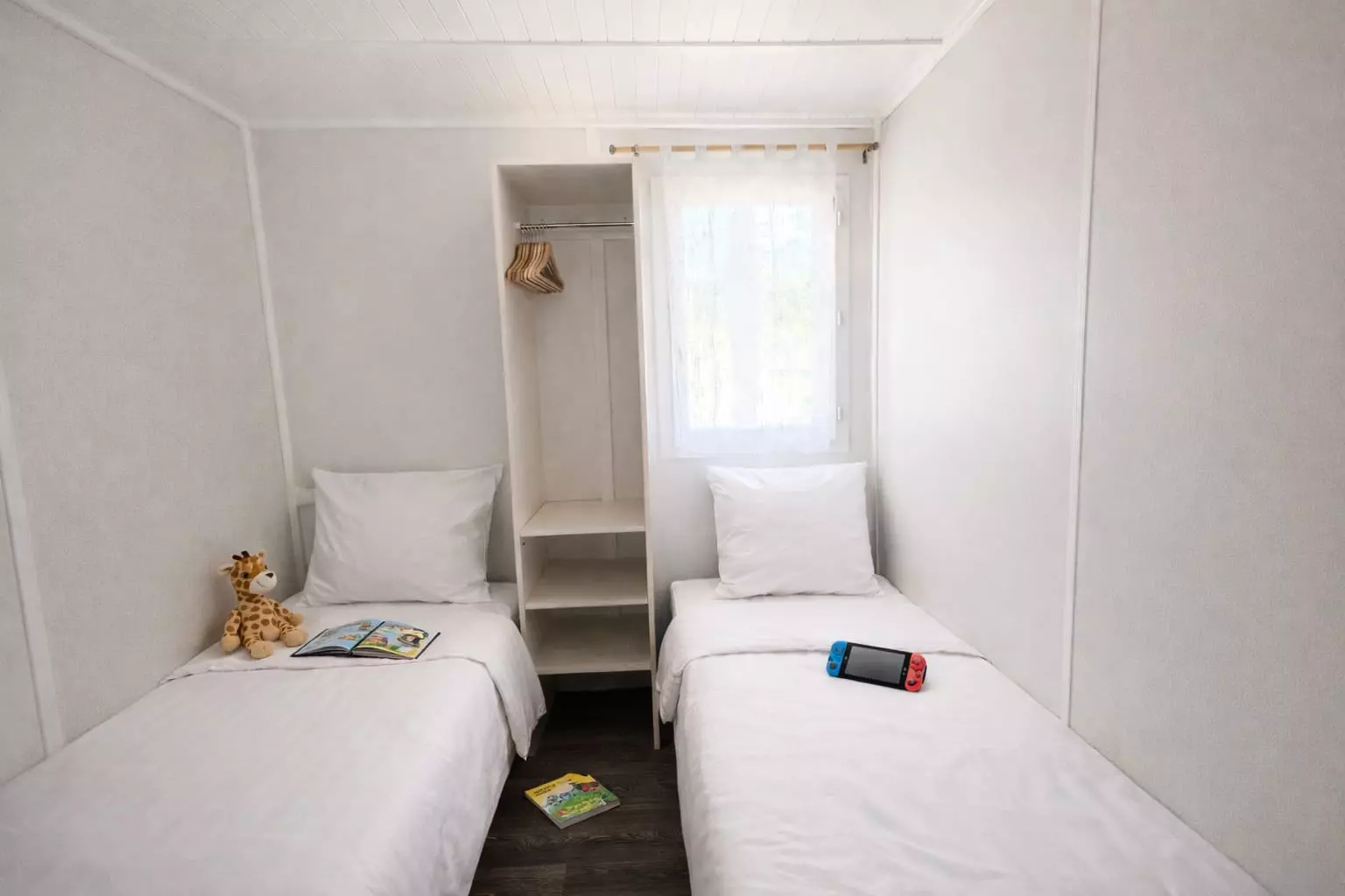Chalet spacieux avec terrasse privative, cuisine équipée (machine à café, grille-pain, bouilloire, ustensiles), salon ouvert, 1 chambre avec lit double (140x200), 1 chambre avec 2 lits simples (80x190), 1 chambre avec lits superposés (2x 80x190), salle de bain, toilettes séparées.