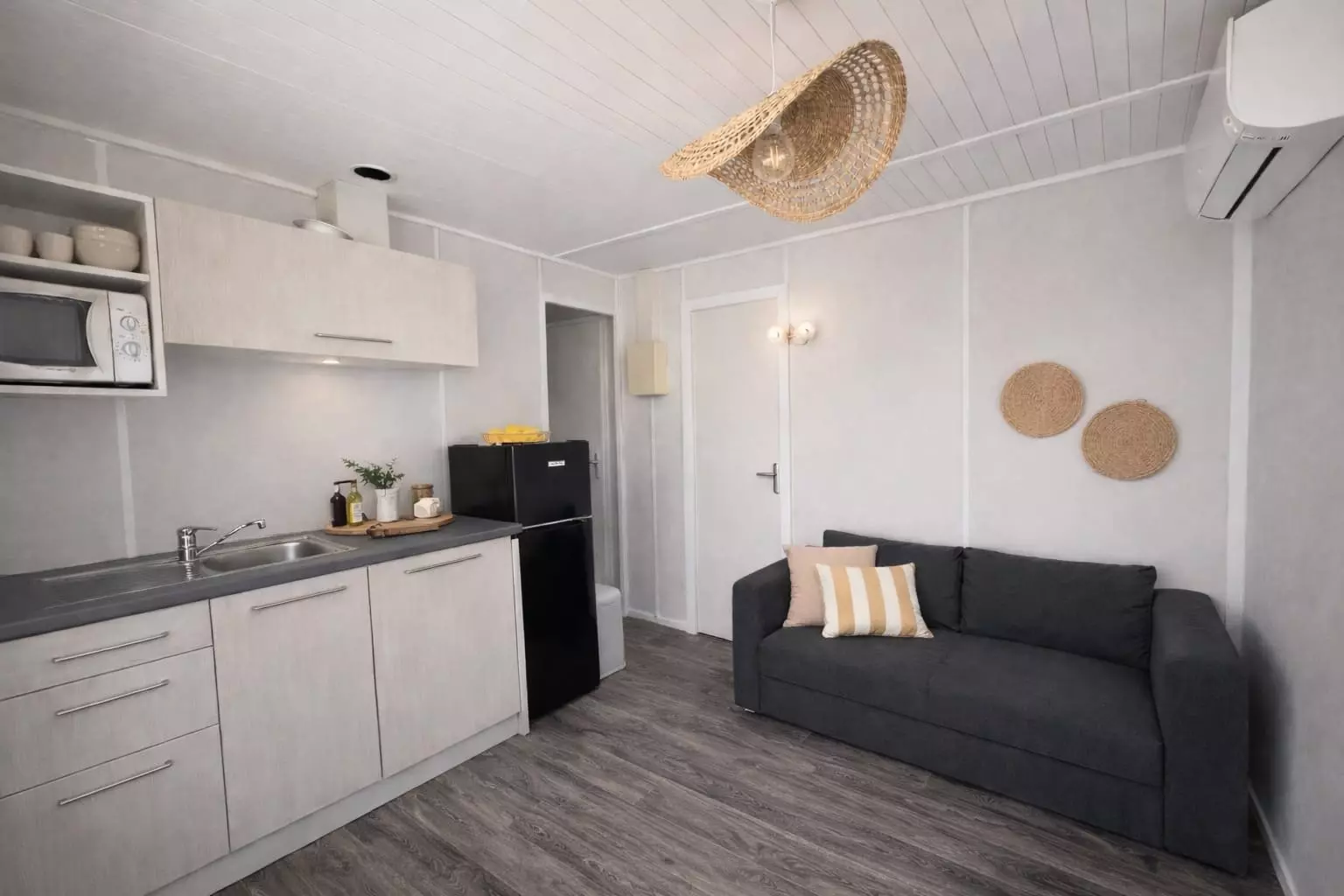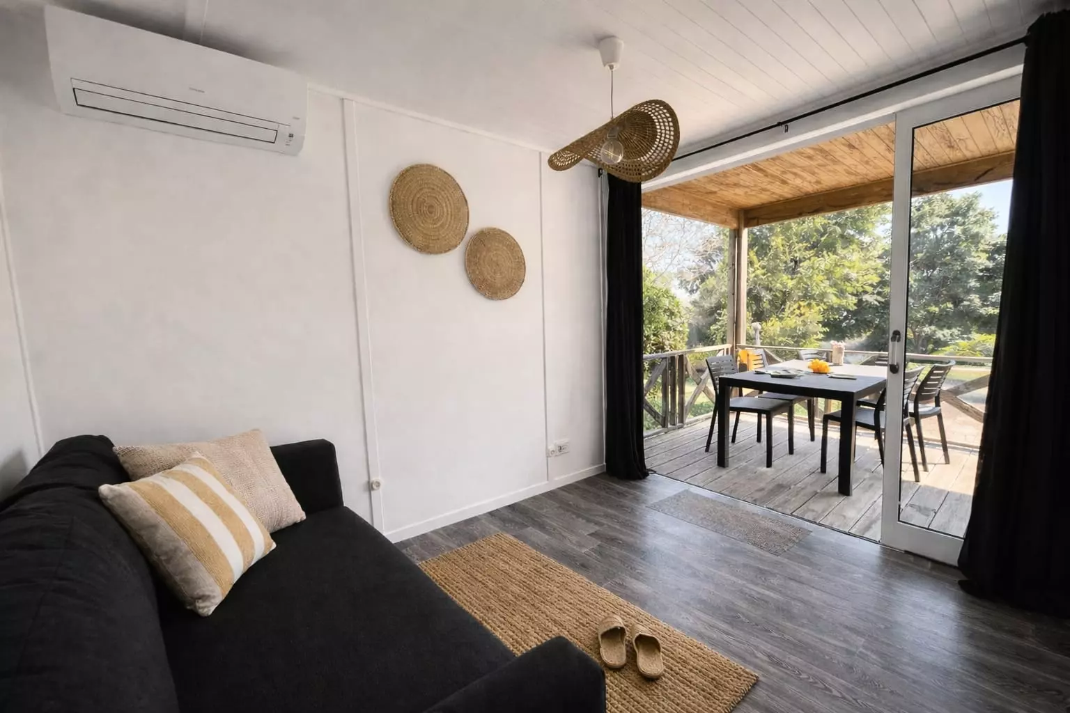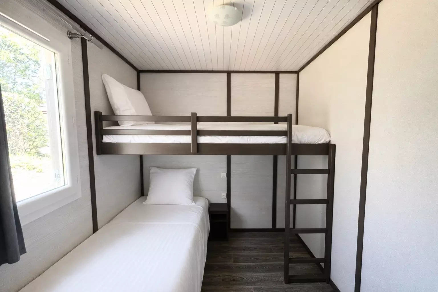 Profitez d'un hébergement confortable et lumineux, intégré à son environnement naturel. Il dispose d'un espace de vie convivial, d'une chambre avec lit double et d'une chambre avec lits superposés, chacune avec accès direct à la salle d'eau, ainsi que d'une terrasse bois.