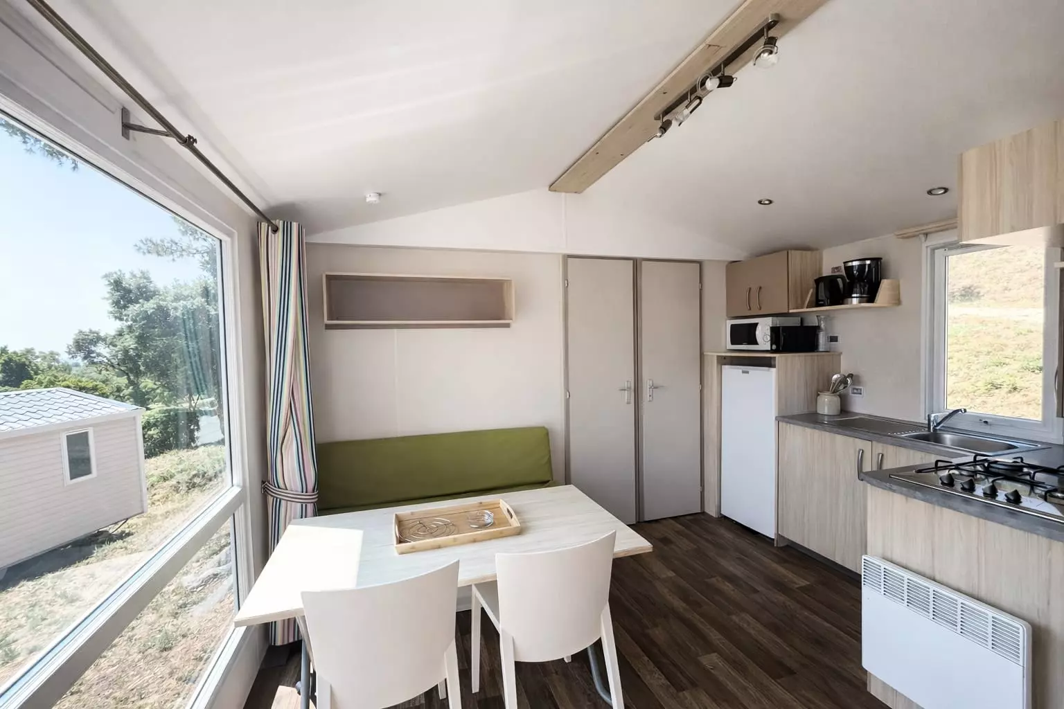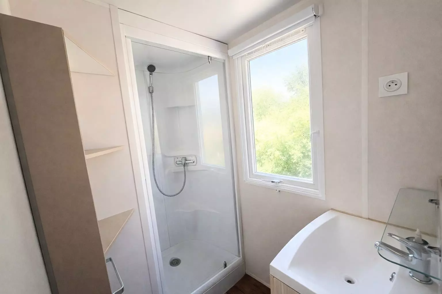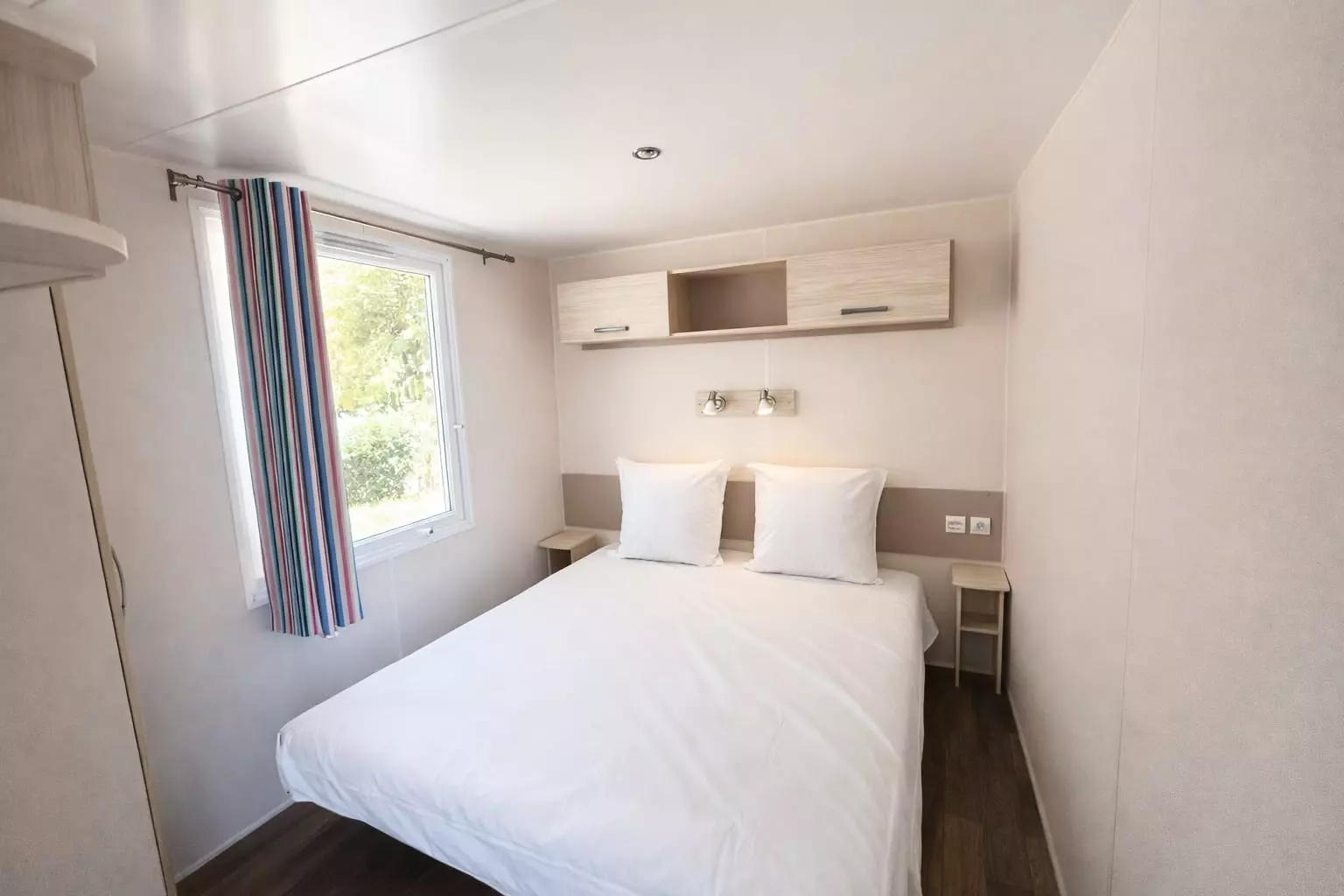 Profitez d'un hébergement confortable et lumineux, intégré à son environnement naturel. Il dispose d'un espace de vie convivial, d'une chambre avec lit double et d'une chambre avec lits superposés, chacune avec accès direct à la salle d'eau, ainsi que d'une terrasse bois.