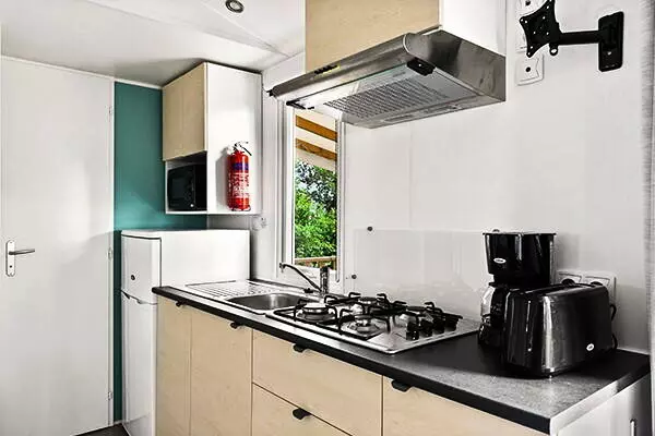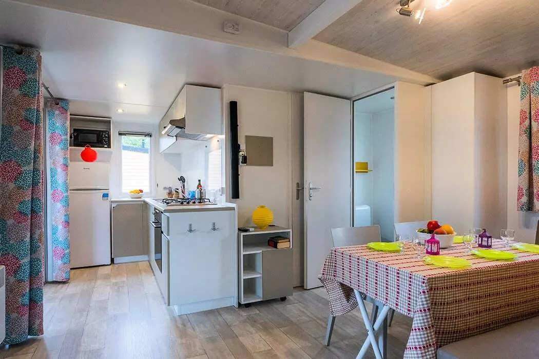 L'aménagement de l'espace de vie varie selon le mobil-home : la cuisine peut se trouver à l'avant ou à l'arrière du mobil-home.