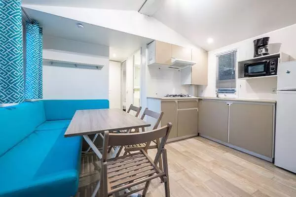 - Séjour / coin cuisine : Banquette, Bouilloire, Cafetière électrique (filtre), Cuisine équipée, Evier, Micro-ondes, Plaque de cuisson 4 feux gaz, Réfrigérateur avec freezer, Table et chaises