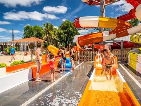 Vient s'ajouter un dernier espace avec 2 autres piscines extérieures chauffées, bain à remous, rivière de marche, pataugeoire chauffée, solarium et 7 pistes de toboggans dont un à bouées pour le plaisir des grands et des petits.