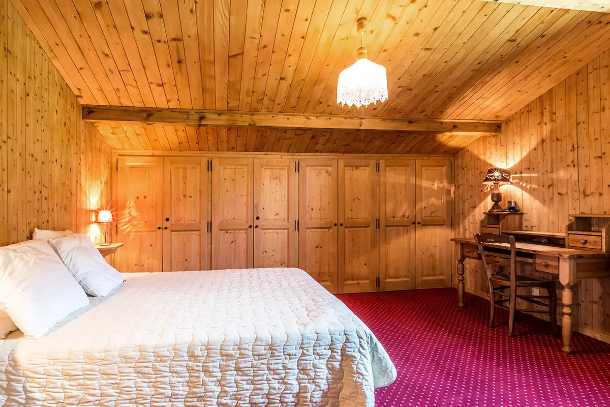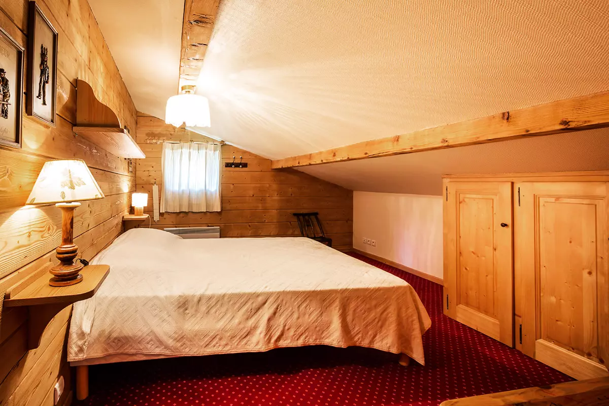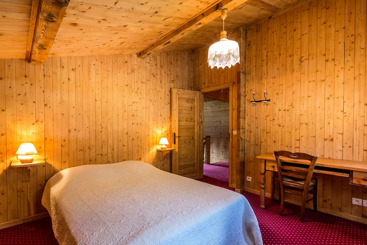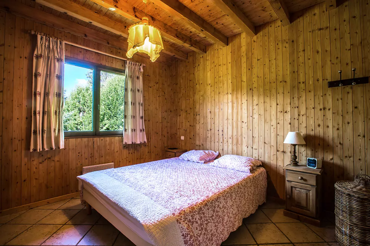 - Chambre 1 (13.22m²): lit 2 pers (160) Couette, fenêtre Ouest, vue chalet