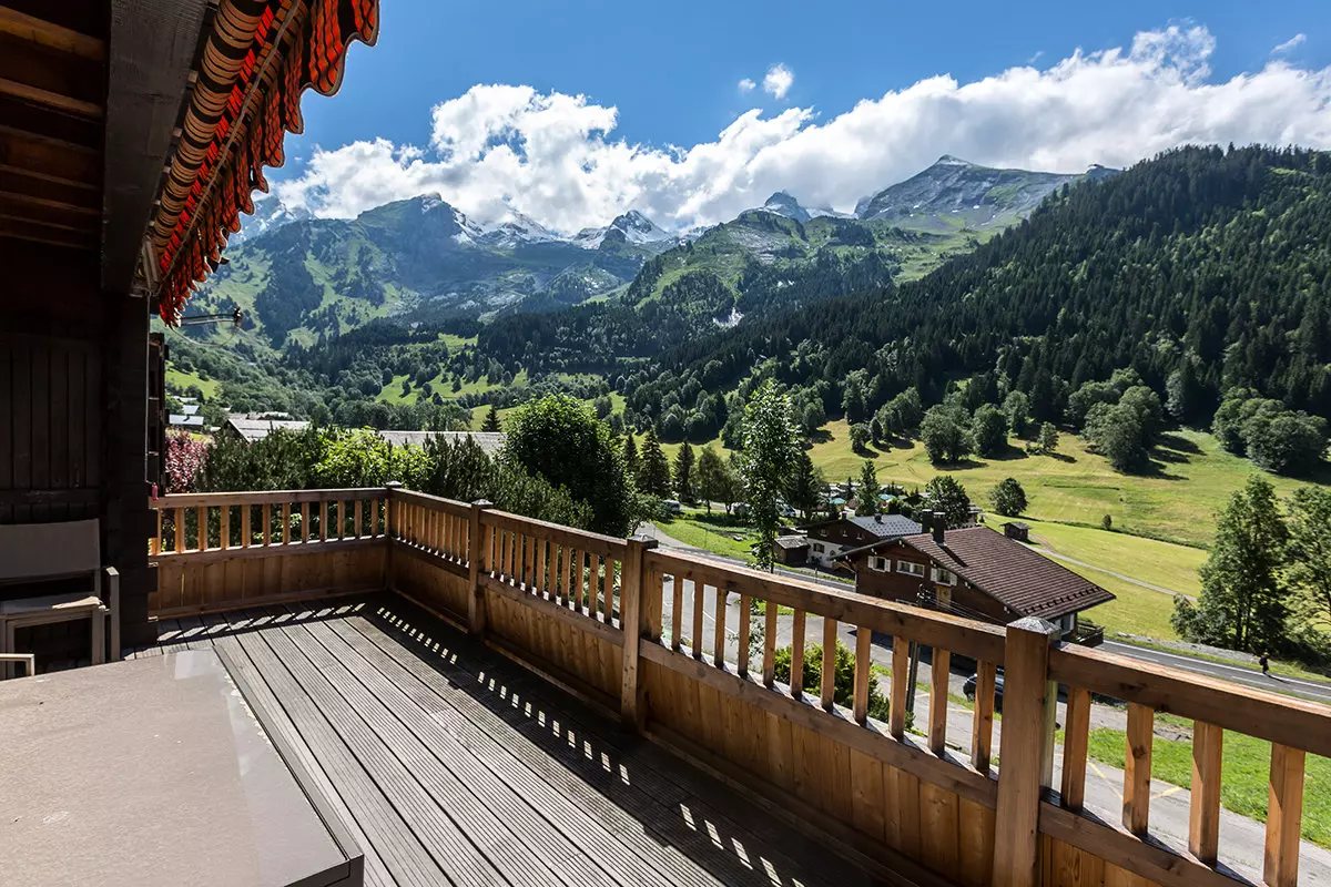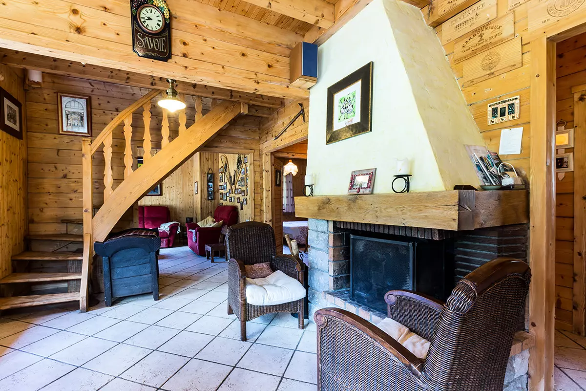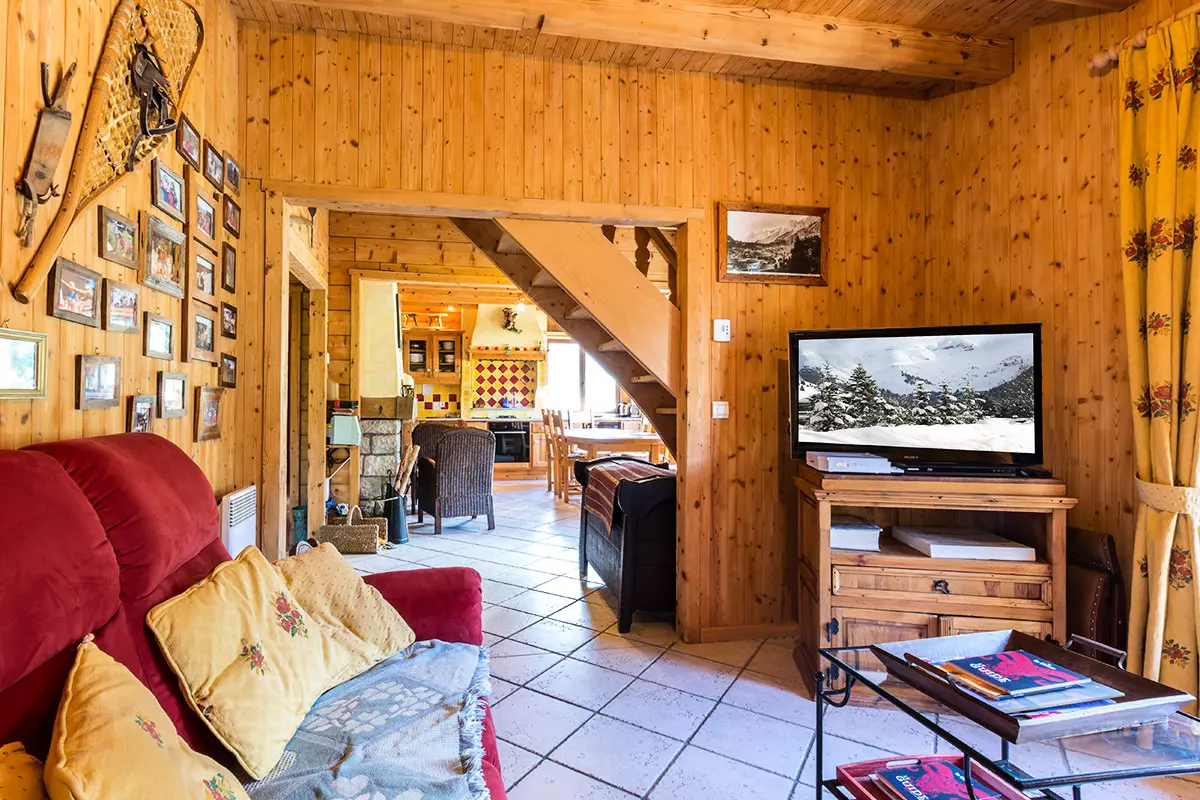 - Salon (11.18m²): banquette, TELEVISION, CHEMINÉE, porte-fenêtre Sud sur balcon terrasse avec BARBECUE (été) et accès direct sur gazon, vue montagne