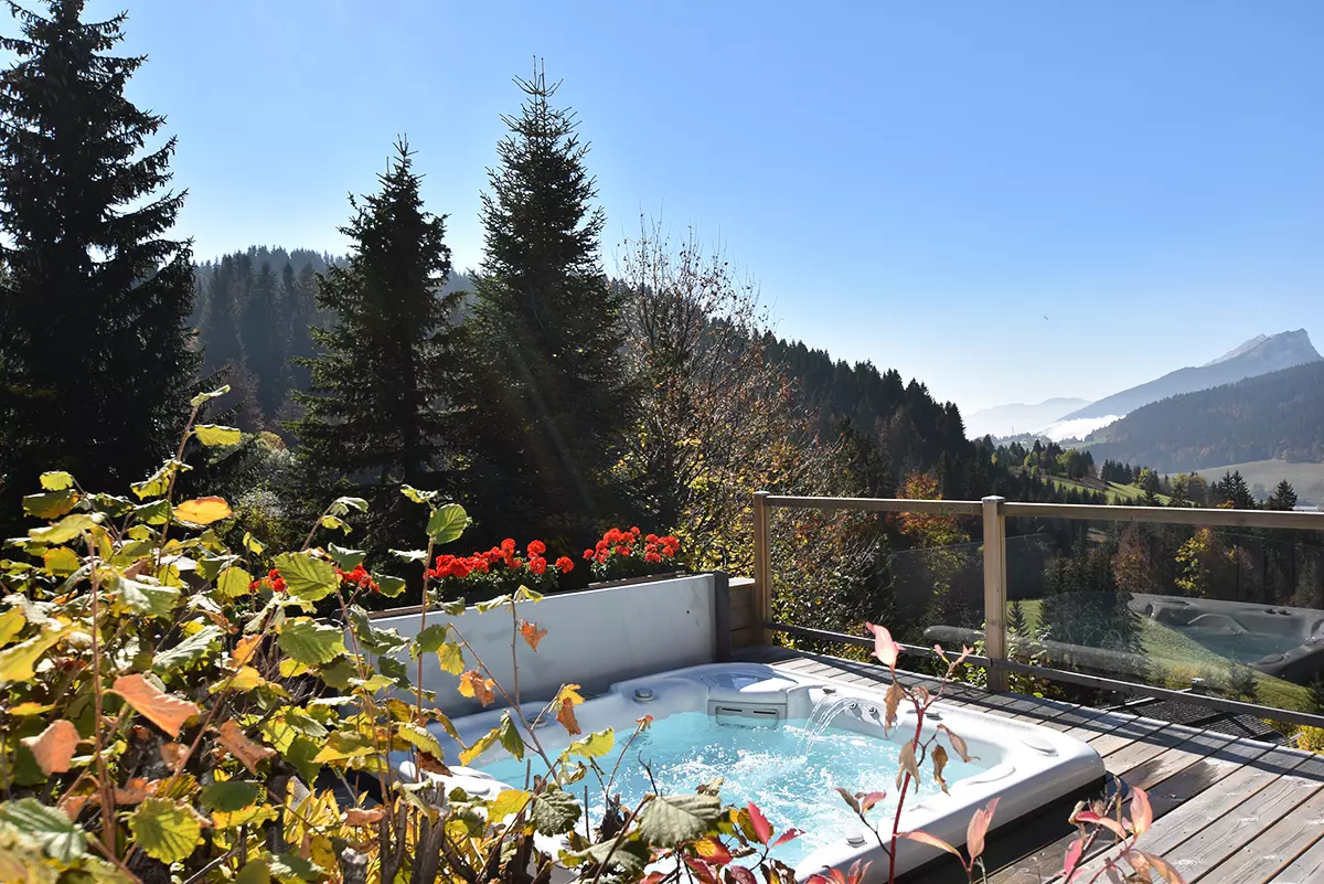 Ce chalet contemporain exposé sud/ouest dispose d'un sauna, d'un bains à remous extérieur ainsi qu'une salle de sport.
