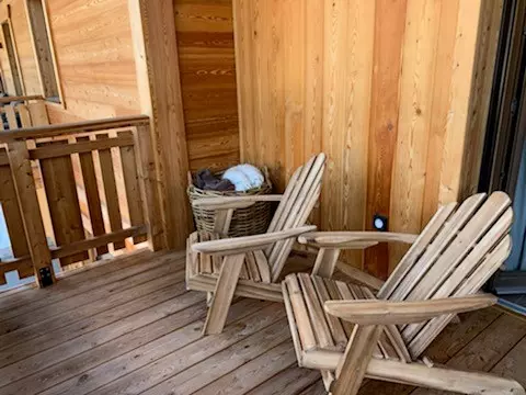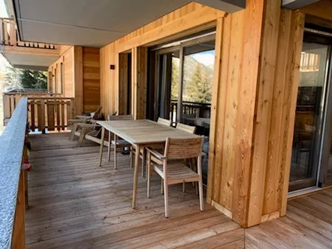 Un grand balcon aménagé de deux chaises longues pour se détendre au soleil et d'une table pour manger dehors.