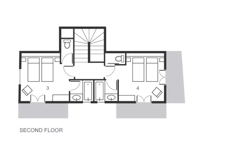 Deux chambres toutes les deux composées de deux lits simples, télévision, une salle de bains avec WC et un balcon.