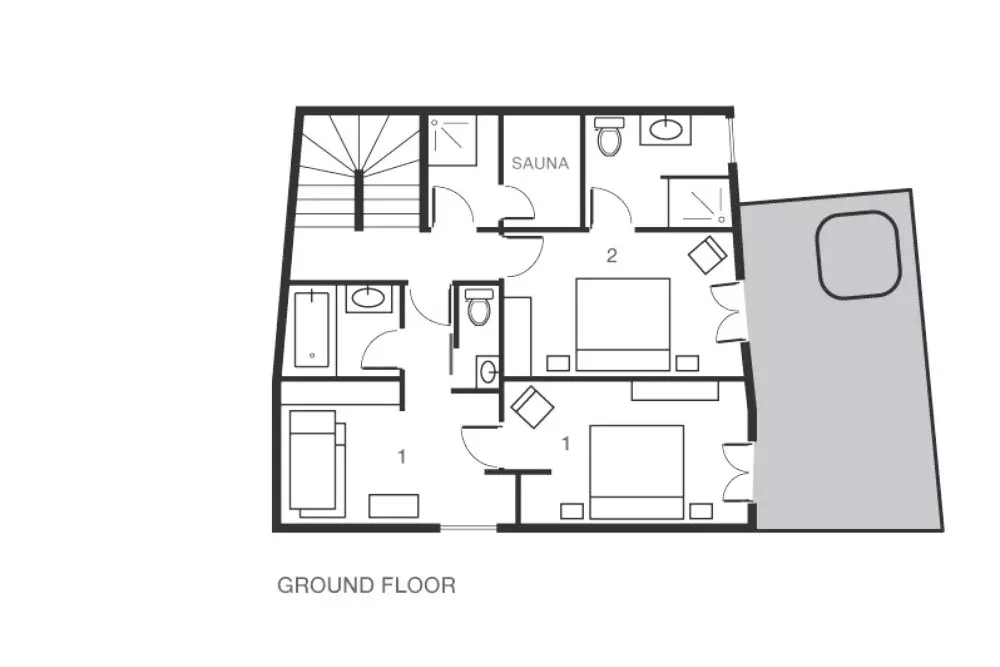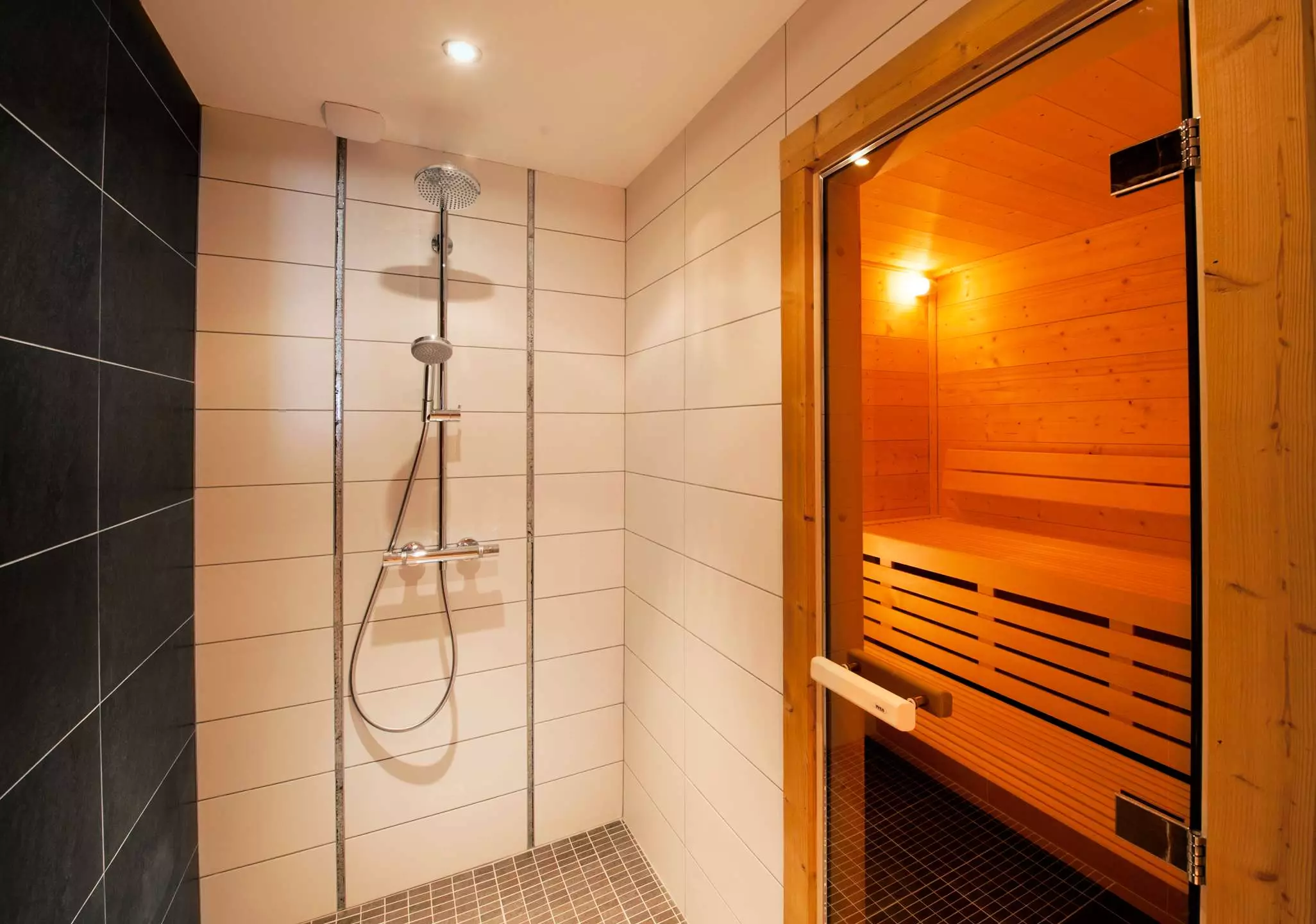 Un sauna avec douche, une chambre avec un lit double, télévision, salle de douche avec WC et balcon donnant sur le SPA extérieur, une suite familiale avec deux lits superposés + une chambre avec lit double de 160, TV et balcon donnant sur SPA extérieur, une salle de bains et un WC .