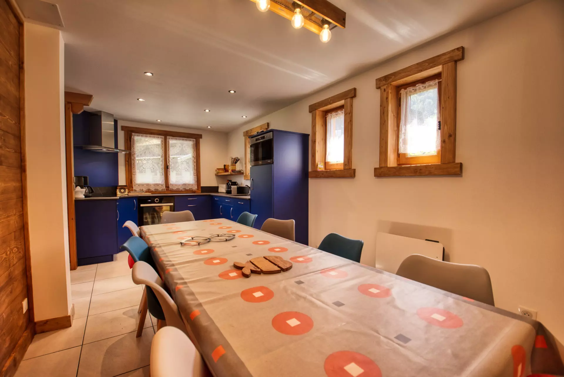 Four- lave-vaisselle- micro-ondes- plaques vitro-céramiques- hotte- cafetière électrique avec filtre-1 cafetière nespresso- 1 balance de cuisine- bouilloire- cocotte minute -grille-pain 2-appareils à fondue- 2 appareils à raclette- vaisselle et batterie de cuisine.
