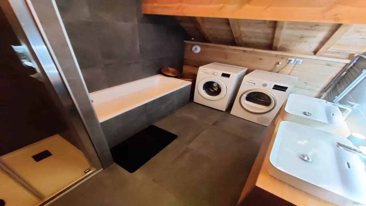 A l'étage : 1 chambre double avec lit en 160, une salle de bains avec baignoire et douche à l'italienne, un lave linge et sèche-linge sont à disposition.