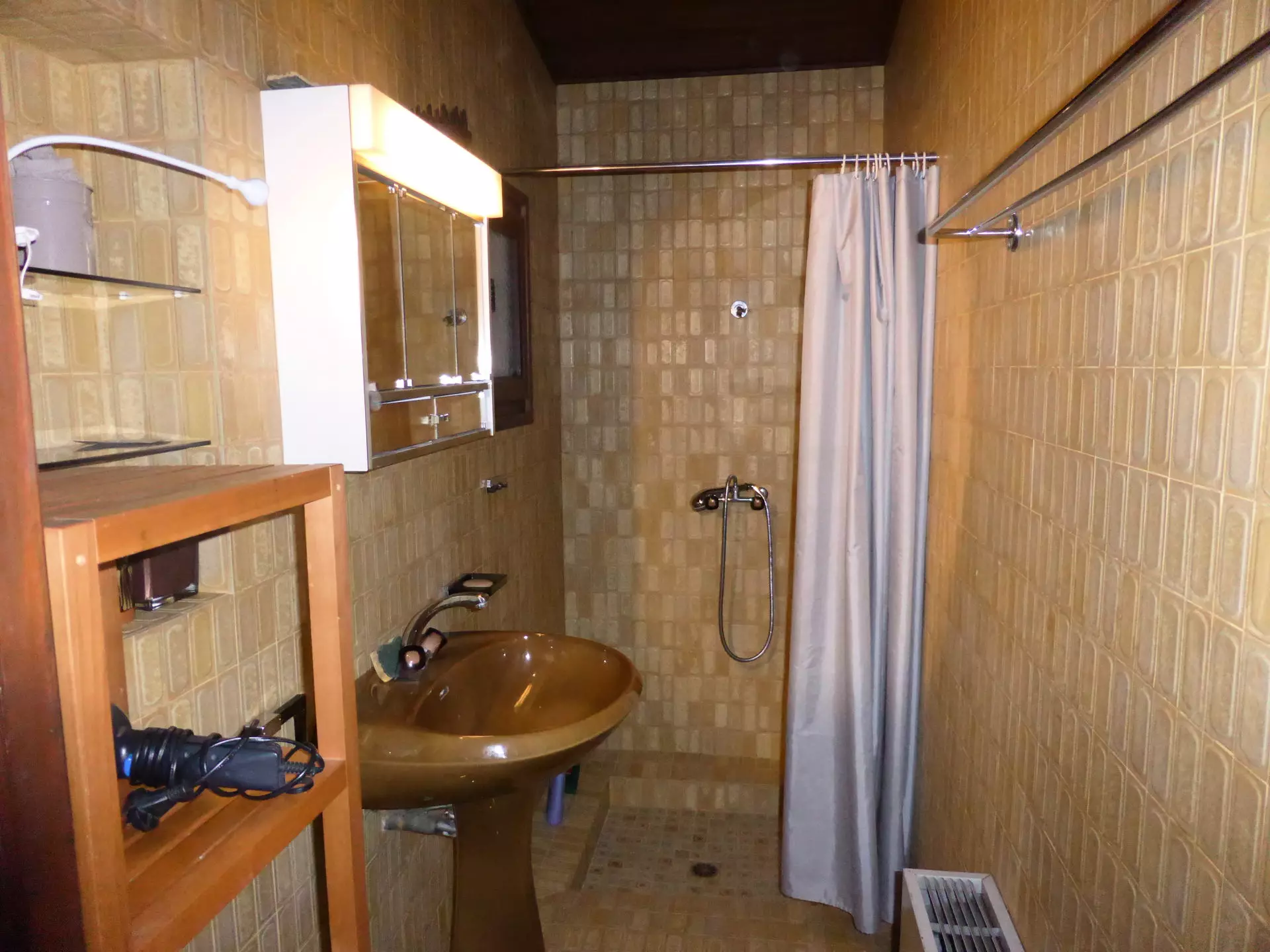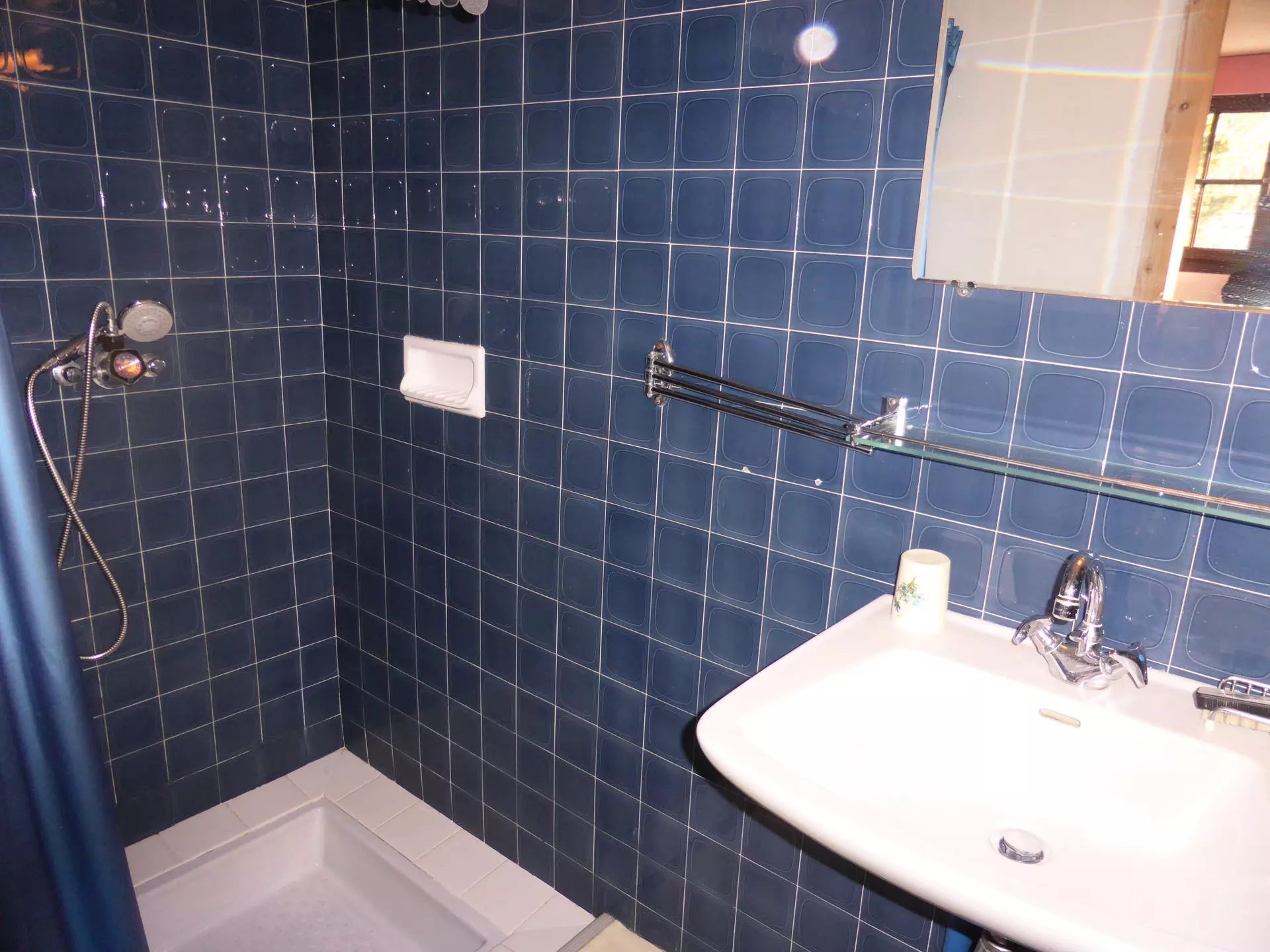 - Une salle de douche avec douche et lavabo.