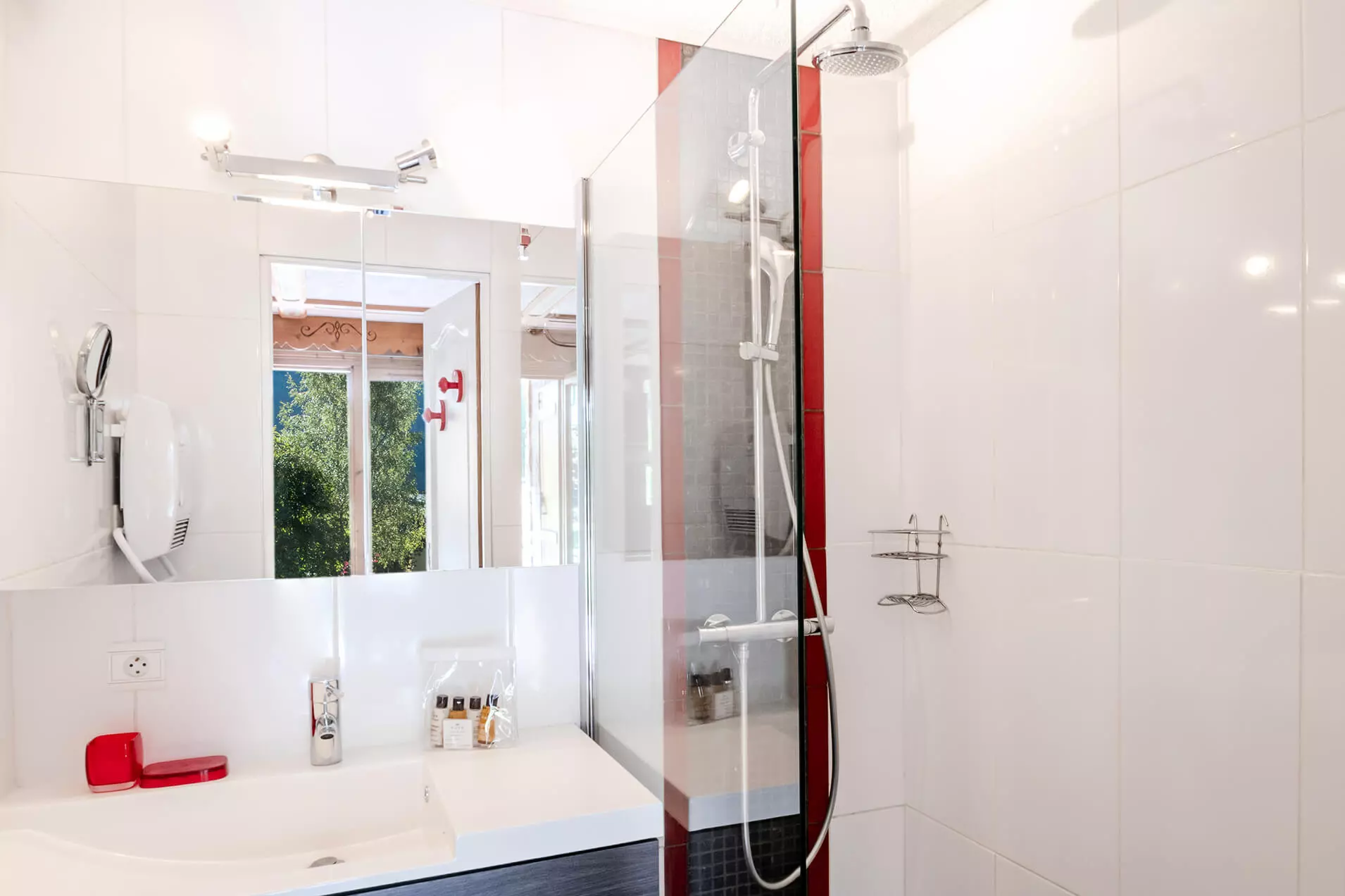 - Chambre avec deux lits simples que l'on peut rapprocher pour faire un lit double (2x80x190) avec fenêtres, douche, lavabo et toilettes