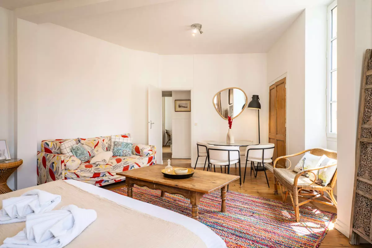 Bienvenue au Charmant Appartement Bordeaux Centre Ville, situé à moins de 300 mètres du cœur de Bordeaux. Cet appartement offre une expérience unique avec son ambiance chaleureuse. Son parquet en bois véritable crée une atmosphère accueillante, tandis que les tapis et housses de canapé rayées ajoutent une touche de charme.