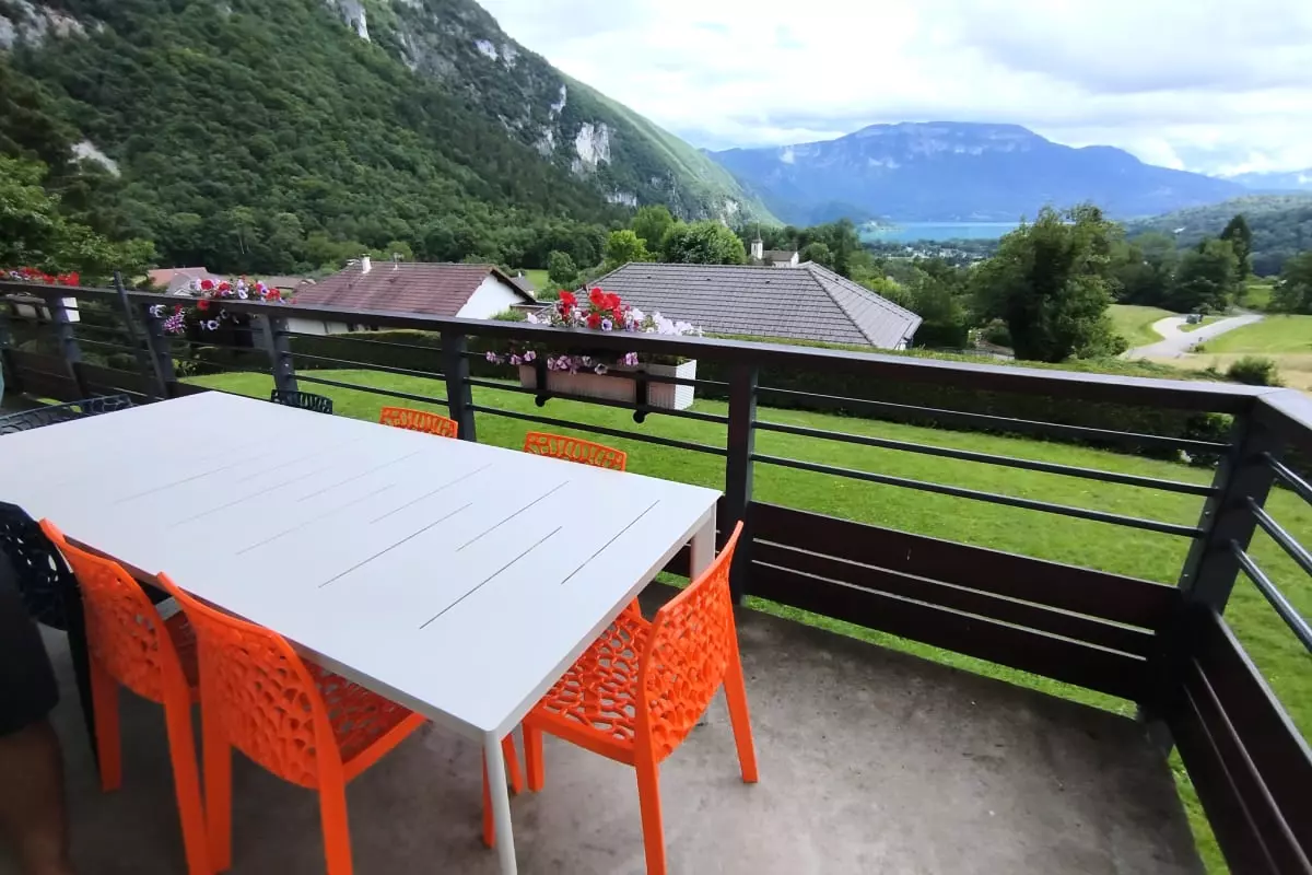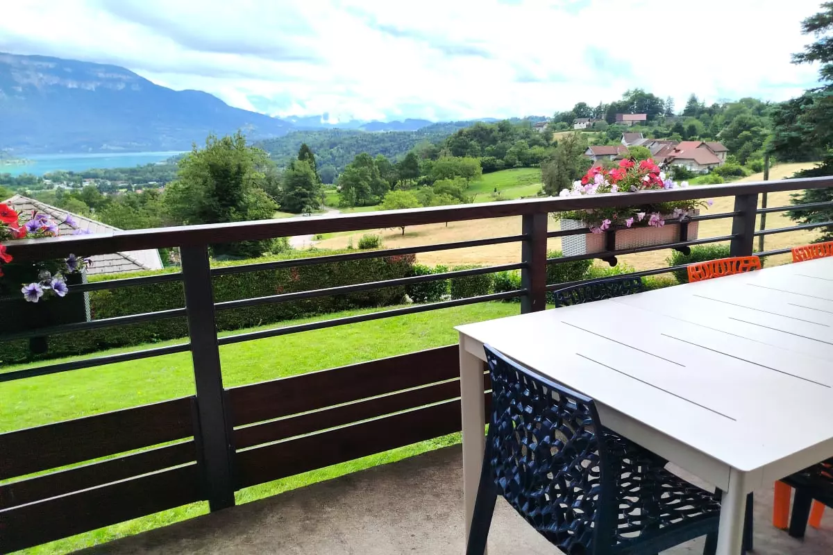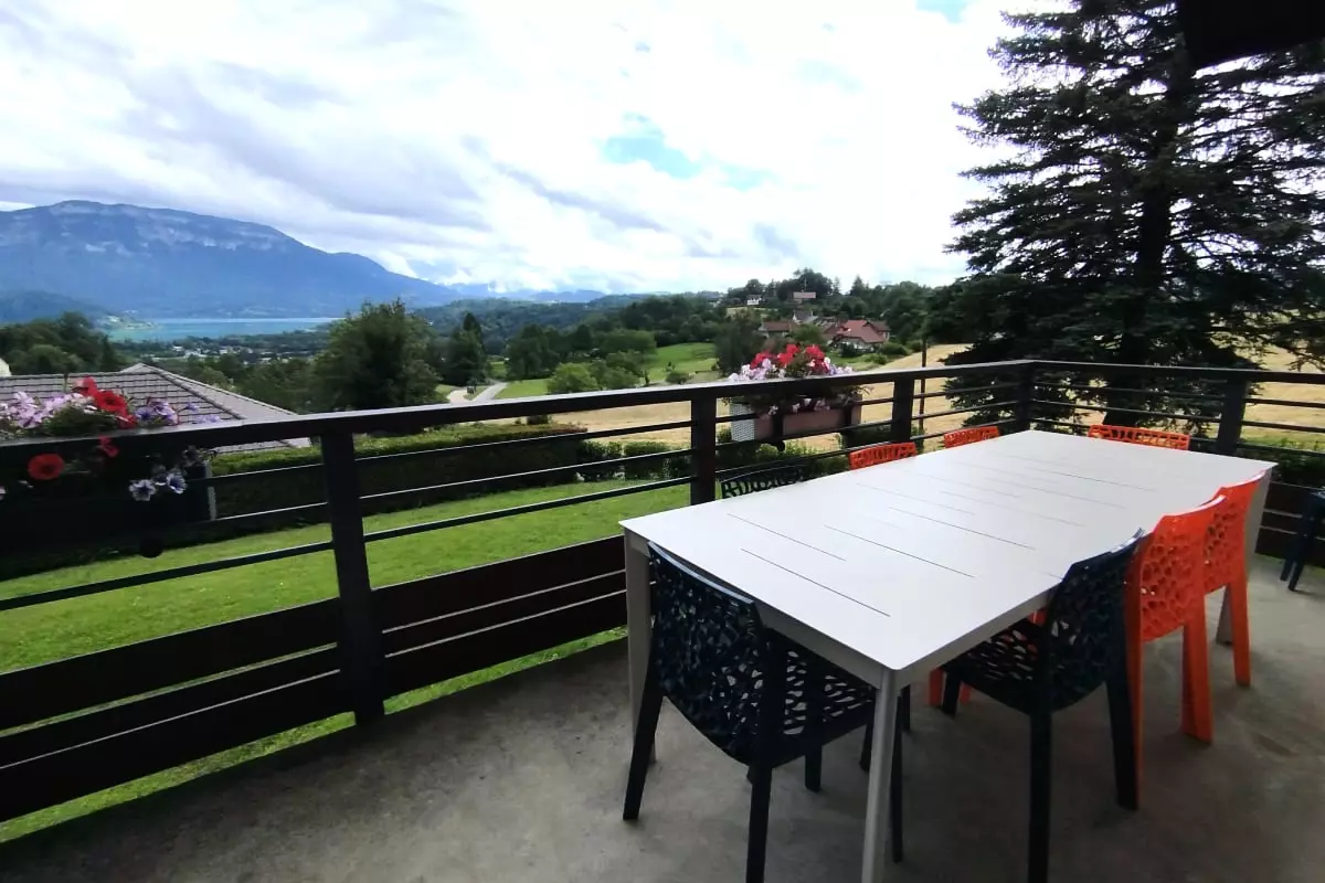 => un accès au grand balcon situé face au lac disposant de 2 tables et de nombreux fauteuils de jardin