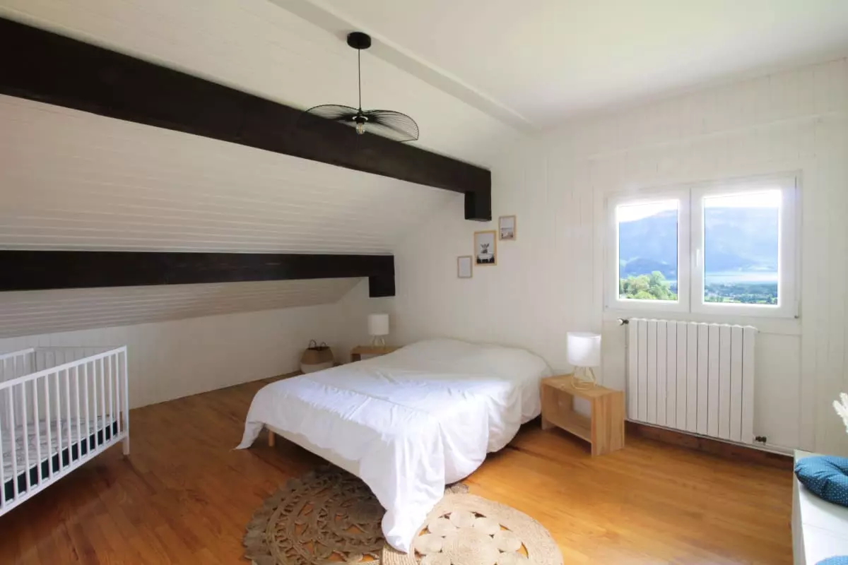 - Une chambre avec lit double (140x190cm) et lit bébé avec vue sur le lac