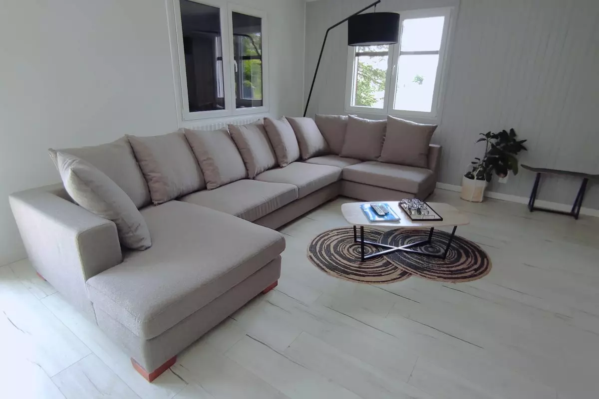 => un espace salon avec l’ensemble traditionnel : immense canapé d’angle tout neuf, table basse et TV.