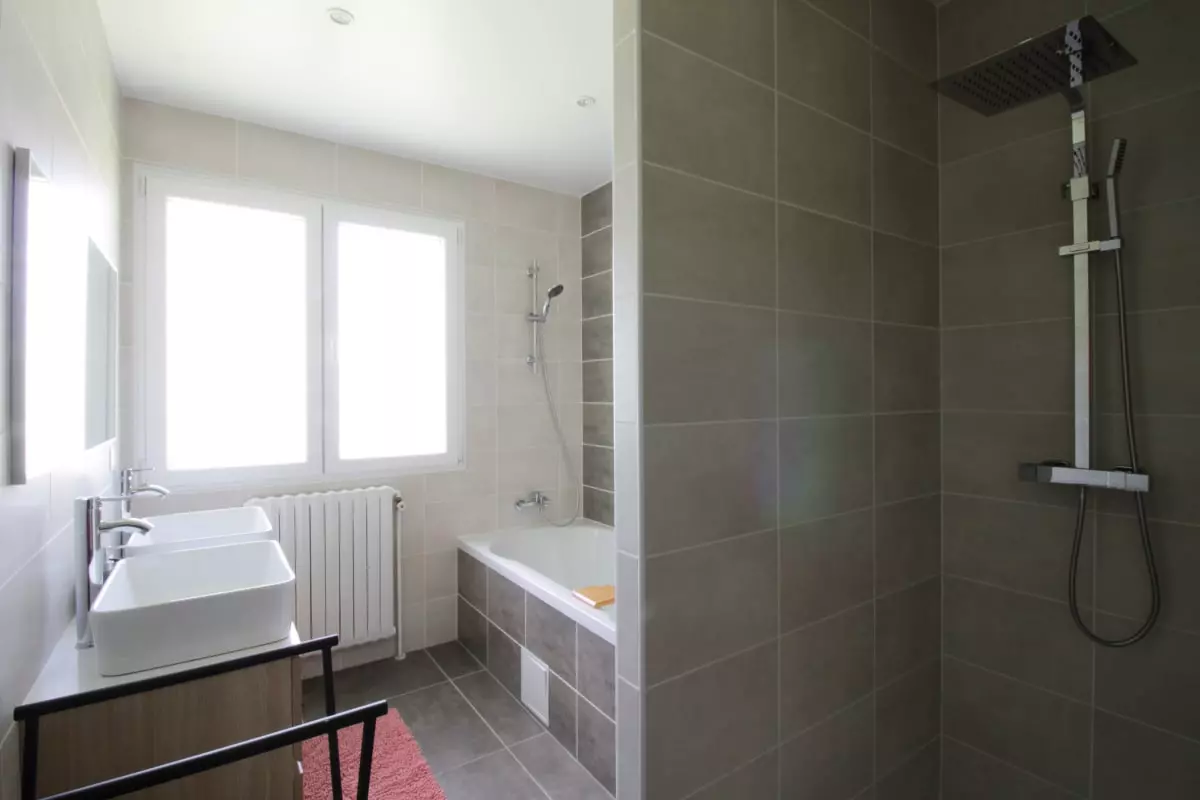 - Une grande salle de bain avec douche italienne, grande baignoire et meuble double vasques