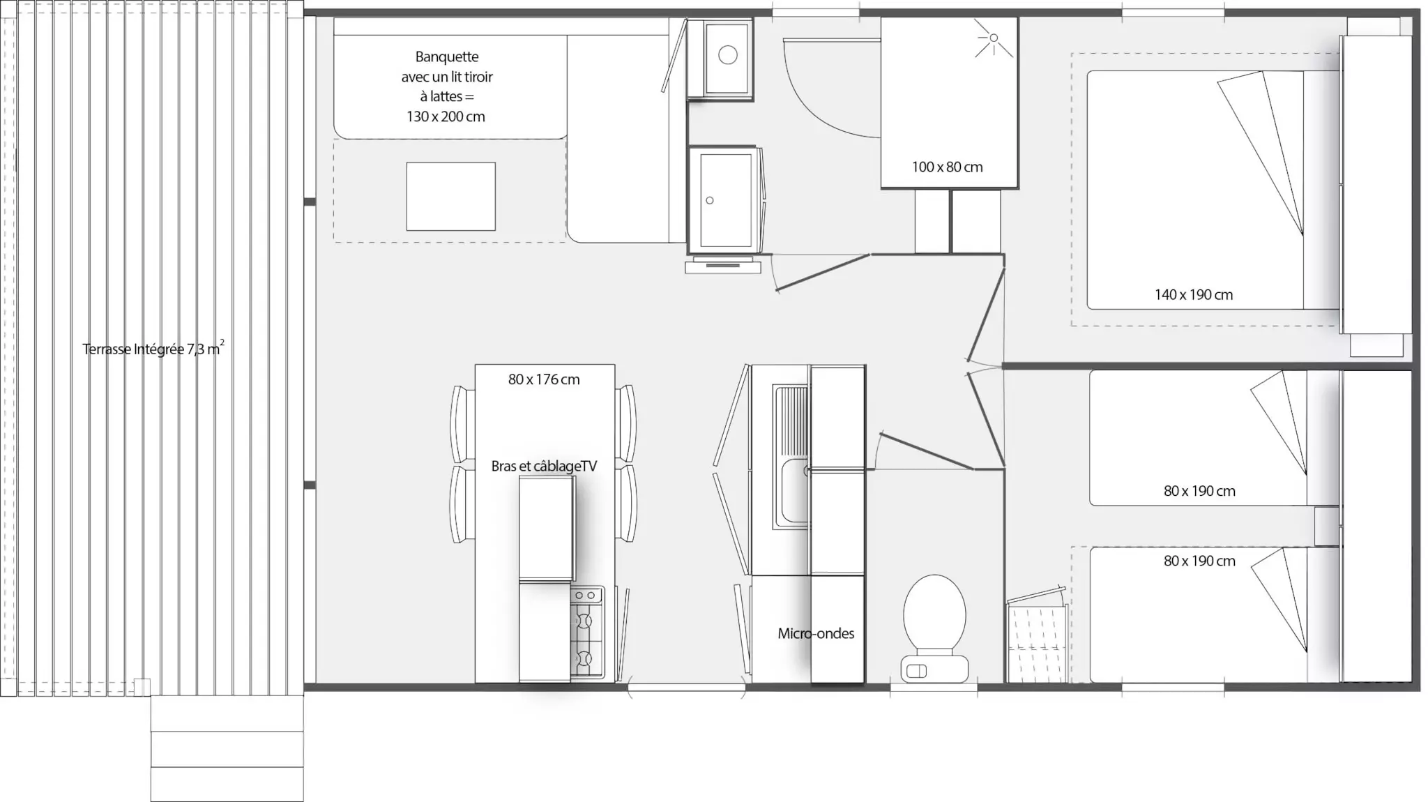 Notre mobile home confort 30m² est le préféré des grandes familles et des tribus d'amis.