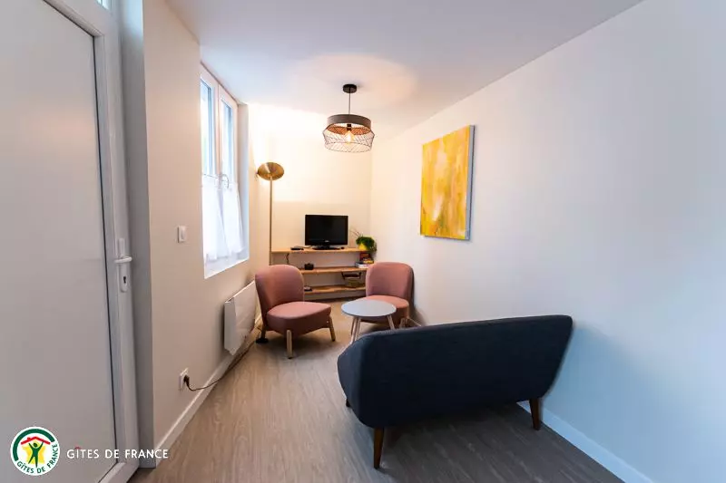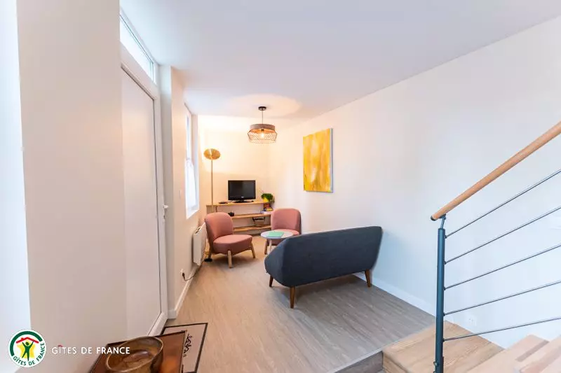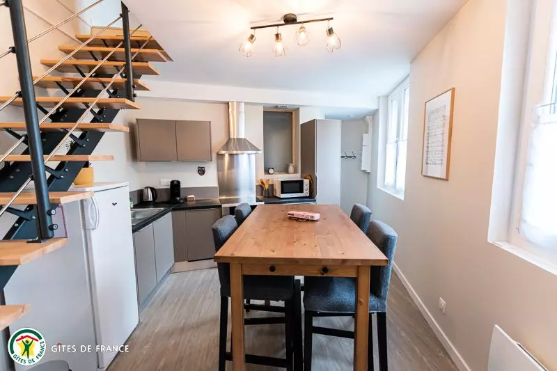 L'appartement dispose, au rez-de-chaussée, d'une grande pièce à vivre regroupant le salon, la salle à manger et la cuisine, ainsi qu'une salle d'eau avec WC et machine à laver.