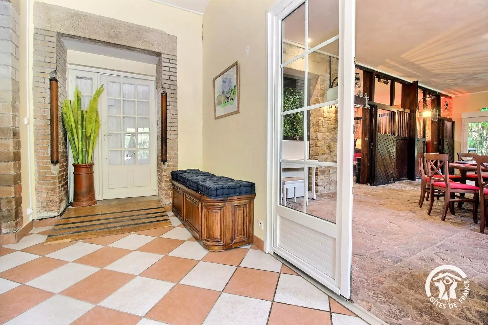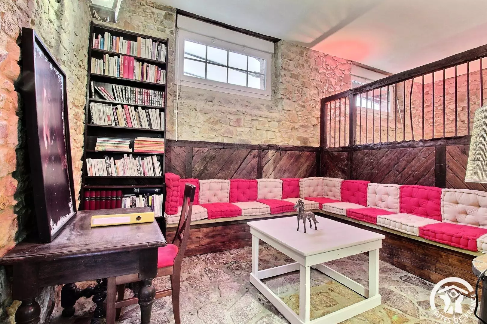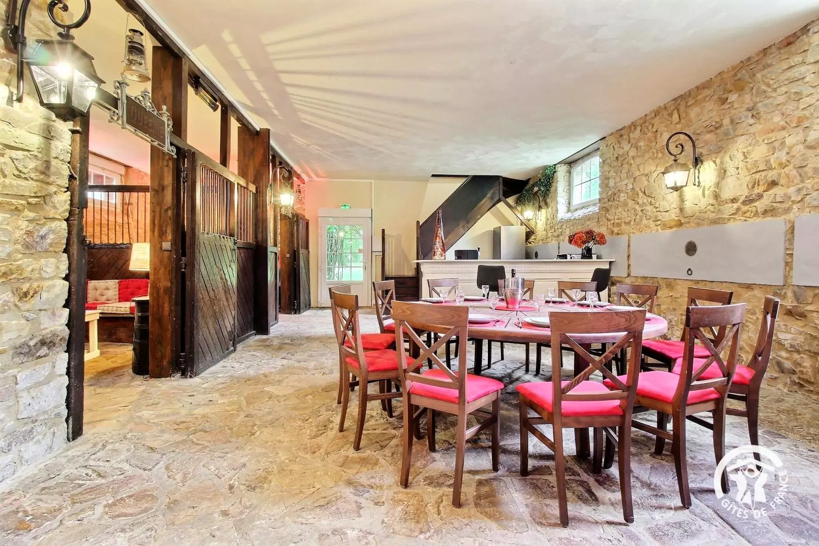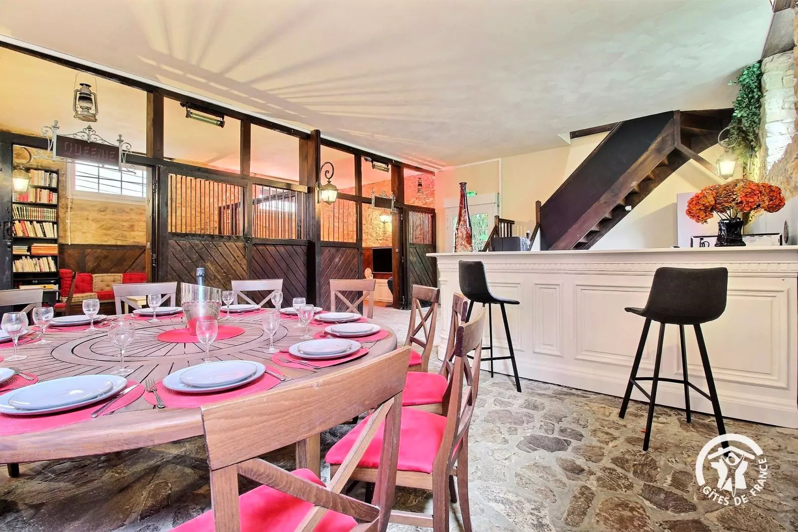 - Grande pièce à vie avec table à manger, cuisine équipée, bar ouvert sur le séjour ainsi que 2 coins salon aménagés dans les anciens boxes de chevaux